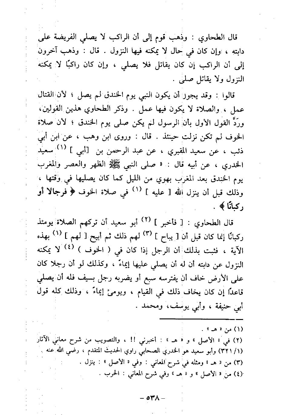 قال الطحاوى: وذهب قوم إلى أن الراكب لا يصلى الفريضة على دابته، وإن كان فى حال لا يمكنه فيها النزول، قال: وذهب آخرون إلى أن الراكب إن كان يقاتل فلا يصلى، وإن كان راكبًا لا يمكنه النزول ولا يقاتل صلى. قالوا: وقد يجوز أن يكون النبى يوم الخندق لم يصل؛ لأن القتال عمل، والصلاة لا يكون فيها عمل، وذكر الطحاوى هذين القولين، ورد القول الأول بأن الرسول لم يكن صلى يوم الخندق؛ لأن صلاة الخوف لم تكن نزلت حينئذ، قال: وروى ابن وهب، عن ابن أبى ذئب، عن سعيد المقبرى، عن عبد الرحمن بن أبى سعيد الخدرى، عن أبيه قال: (صلى النبى (صلى الله عليه وسلم) الظهر والعصر والمغرب يوم الخندق بعد المغرب بهوى من الليل كما كان يصليها فى وقتها، وذلك قبل أن ينزل الله عليه فى صلاة الخوف) فرجالاً أو ركبانًا (. قال الطحاوى: فأخبر أبو سعيد أن تركهم الصلاة يومئذ ركبانًا، إنما كان قبل أن يباح لهم ذلك ثم أبيح لهم بهذه الآية، فثبت بذلك أن الرجل إذا كان فى الخوف لا يمكنه النزول عن دابته أن له أن يصلى عليها إيماءً، وكذلك لو أن رجلاً كان على الأرض خاف أن يفترسه سبع أو يضربه رجل بسيف فله أن يصلى قاعدًا إن كان يخاف ذلك فى القيام، ويومئ إيماءً، وذلك كله قول أبى حنيفة، وأبى يوسف، ومحمد.