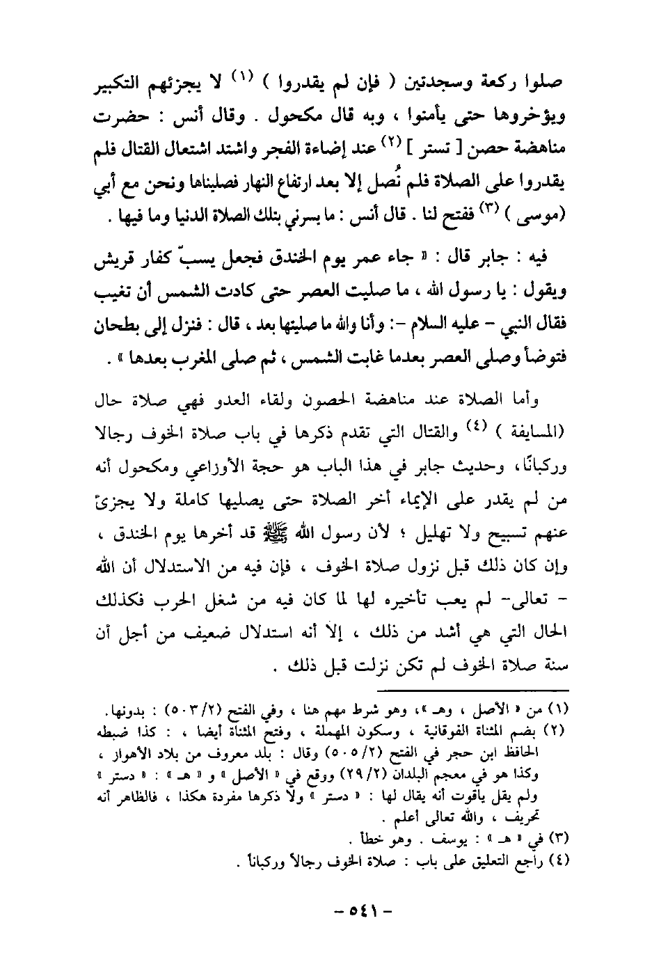 صَلَّوْا رَكْعَةً وَسَجْدَتَيْنِ، فَإِنْ لَمْ يَقْدِرُوا، لا يُجْزِئُهُمُ التَّكْبِيرُ، وَيُؤَخِّرُوهَا، حَتَّى يَأْمَنُوا، وَبِهِ قَالَ مَكْحُولٌ. وَقَالَ أَنَسُ بْنُ مَالِكٍ: حَضَرْتُ عِنْدَ مُنَاهَضَةِ حِصْنِ تُسْتَرَ عِنْدَ إِضَاءَةِ الْفَجْرِ، وَاشْتَدَّ اشْتِعَالُ الْقِتَالِ، فَلَمْ يَقْدِرُوا عَلَى الصَّلاةِ، فَلَمْ نُصَلِّ إِلا بَعْدَ ارْتِفَاعِ النَّهَارِ، فَصَلَّيْنَاهَا وَنَحْنُ مَعَ أَبِي مُوسَى، فَفُتِحَ لَنَا. قَالَ أَنَسُ: مَا يَسُرُّنِي بِتِلْكَ الصَّلاةِ الدُّنْيَا وَمَا فِيهَا. / 64 - فيه: جابر قال: (جَاءَ عُمَرُ يَوْمَ الْخَنْدَقِ، فَجَعَلَ يَسُبُّ كُفَّارَ قُرَيْشٍ، وَيَقُولُ: يَا رَسُولَ اللَّهِ مَا صَلَّيْتُ الْعَصْرَ حَتَّى كَادَتِ الشَّمْسُ أَنْ تَغِيبَ، فَقَالَ النَّبِيُّ عَلَيهِ السَّلاَم: وَأَنَا وَاللَّهِ مَا صَلَّيْتُهَا بَعْدُ، قَالَ: فَنَزَلَ إِلَى بُطْحَانَ، فَتَوَضَّأَ، وَصَلَّى الْعَصْرَ، بَعْدَ مَا غَابَتِ الشَّمْسُ، ثُمَّ صَلَّى الْمَغْرِبَ بَعْدَهَا) . وأما الصلاة عند مناهضة الحصون ولقاء العدو فهى صلاة حال المسايفة والقتال التى تقدم ذكرها فى باب صلاة الخوف رجالاً وركبانًا، وحديث جابر فى هذا الباب هو حجة الأوزاعى، ومكحول أنه من لم يقدر على الإيماء أخر الصلاة حتى يصليها كاملة ولا يجزئ عنهم تسبيح ولا تهليل؛ لأن رسول الله (صلى الله عليه وسلم) قد أخرها يوم الخندق، وإن كان ذلك قبل نزول صلاة الخوف، فإن فيه من الاستدلال أن الله تعالى، لم يعب تأخيره لها لما كان فيه من شغل الحرب، فكذلك الحال التى هى أشد من ذلك، إلا أنه استدلال ضعيف من أجل أن سنة صلاة الخوف لم تكن نزلت قبل ذلك.
