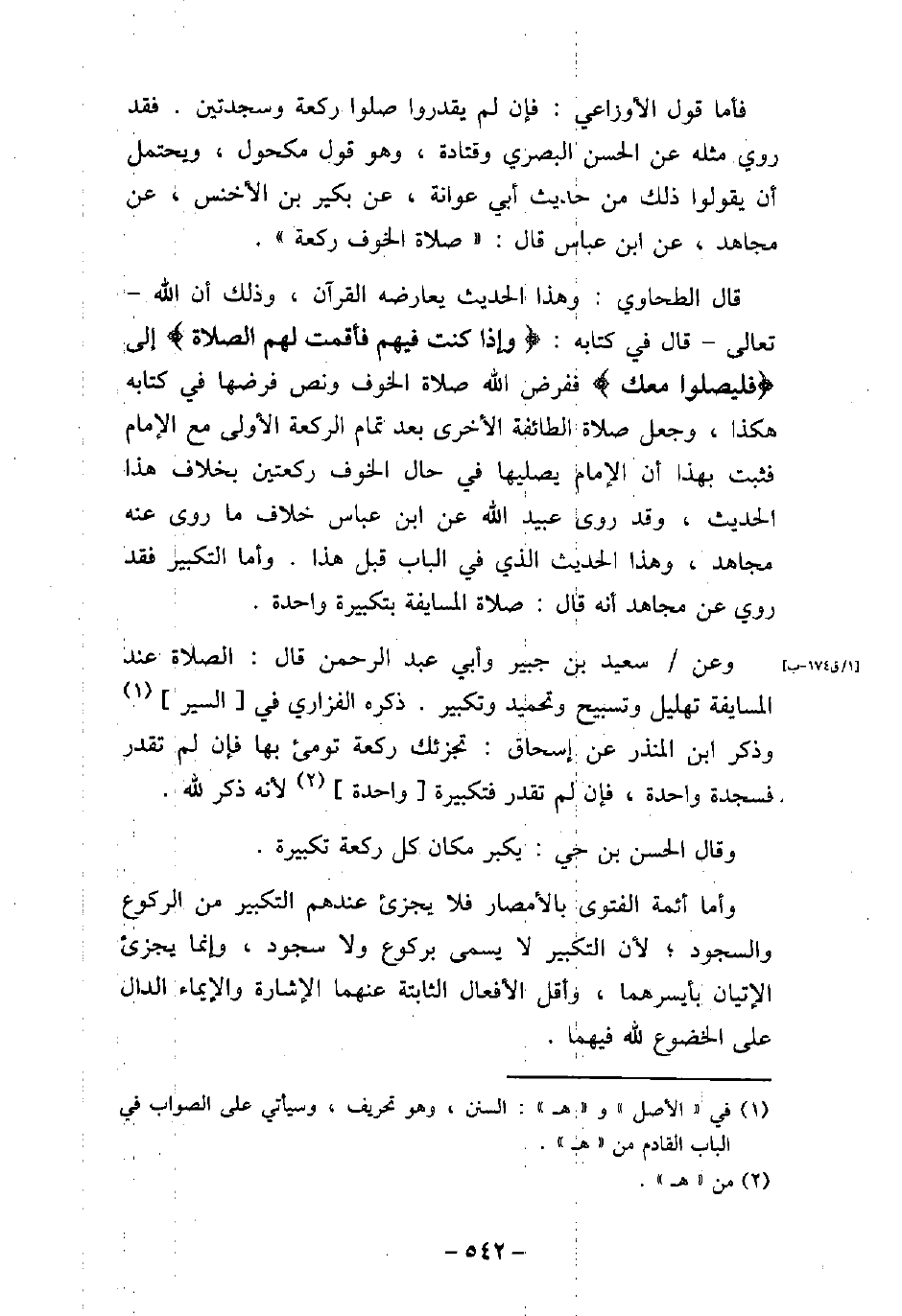 فأما قول الأوزاعى: فإن لم يقدروا صلوا ركع وسجدتين، فقد روى مثله عن الحسن البصرى وقتادة، وهو قول مكحول، ويحتمل أن يقولوا ذلك من حديث أبى عوانة، عن بكير بن الأخنس، عن مجاهد، عن ابن عباس قال: (صلاة الخوف ركعة) . قال الطحاوى: وهذا الحديث يعارضه القرآن، وذلك أن الله، تعالى، قال فى كتابه: (وإذا كنت فيهم فأقمت لهم الصلاة (إلى) فليصلوا معك) [النساء: 102] ، ففرض الله صلاة الخوف ونص فرضها فى كتابه هكذا، وجعل صلاة الطائفة الأخرى بعد تمام الركعة الأولى مع الإمام، فثبت بهذا أن الإمام يصليها فى حال الخوف ركعتين بخلاف هذا الحديث، وقد روى عبيد الله عن ابن عباس خلاف ما روى عنه مجاهد، وهذا الحديث الذى فى الباب قبل هذا، وأما التكبير فقد روى عن مجاهد أنه قال: صلاة المسايفة بتكبيرة واحدة. وعن سعيد بن جبير، وأبى عبد الرحمن قال: الصلاة عند المسايفة تهليل وتسبيح وتحميد وتكبير، ذكره الفزارى فى السير، وذكر ابن المنذر عن إسحاق: تجزئك ركعة تومئ بها، فإن لم تقدر فسجدة واحدة، فإن لم تقدر فتكبيرة واحدة؛ لأنه ذكر لله. وقال الحسن بن حى: يكبر مكان كل ركعة تكبيرة. وأما أئمة الفتوى بالأمصار فلا يجزئ عندهم التكبير من الركوع والسجود؛ لأن التكبير لا يسمى بركوع ولا سجود، وإنما يجزئ الإتيان بأيسرهما، وأقل الأفعال الثابتة عنهما الإشارة والإيماء الدال على الخضوع لله فيهما.