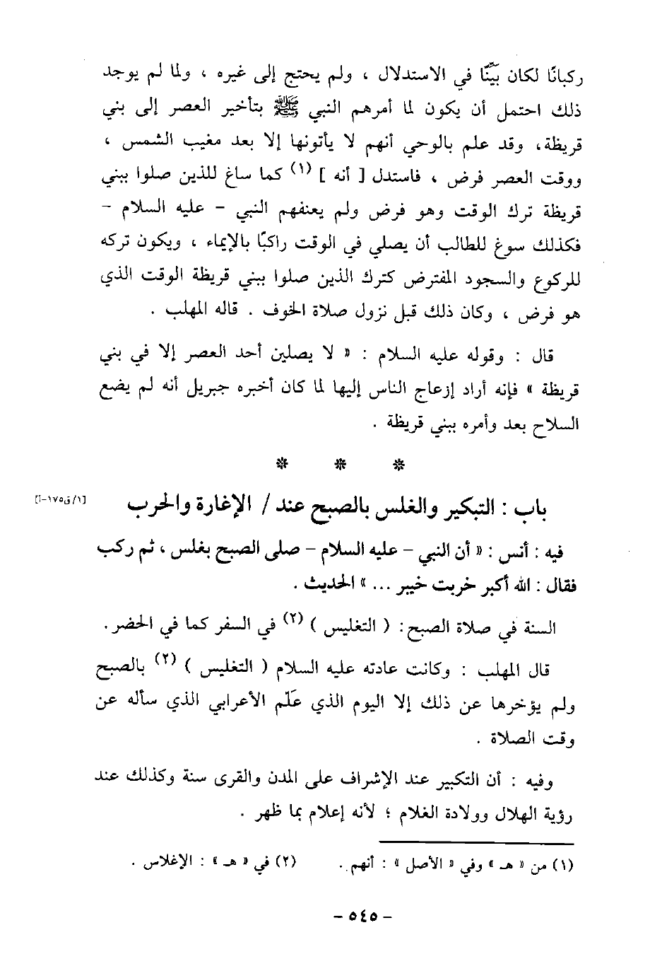 / 66 - فيه: أَنَسِ (أَنَّ رَسُولَ اللَّهِ (صلى الله عليه وسلم) صَلَّى الصُّبْحَ بِغَلَسٍ، ثُمَّ رَكِبَ، فَقَالَ: اللَّهُ أَكْبَرُ، خَرِبَتْ خَيْبَرُ. . . . .) الحديث. السنة فى صلاة الصبح: التغليس فى السفر كما فى الحضر. قال المهلب: وكانت عادته عليه السلام، التغليس بالصبح ولم يؤخرها عن ذلك إلا اليوم الذى علم الأعرابى الذى سأله عن وقت الصلاة. وفيه: أن التكبير عند الإشراف على المدن والقرى سنة، وكذلك عند رؤية الهلال وولادة الغلام؛ لأنه إعلام بما ظهر.