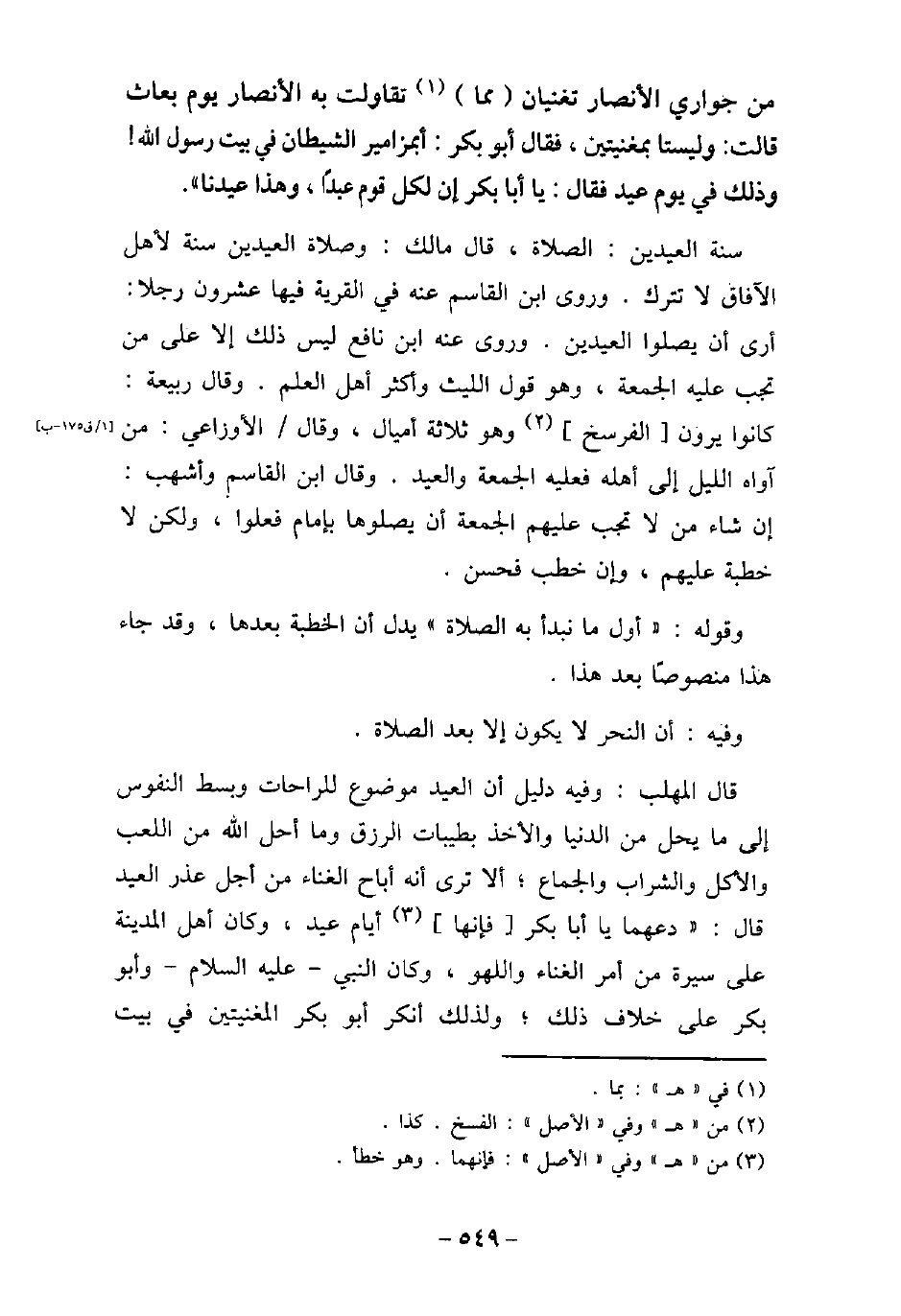 مِنْ جَوَارِي الأنْصَارِ تُغَنِّيَانِ، مِمَا تَقَاوَلَتِ به الأنْصَارُ يَوْمَ بُعَاثَ، قَالَتْ: وَلَيْسَتَا بِمُغَنِّيَتَيْنِ، فَقَالَ أَبُو بَكْرٍ: أَمَزَامِيرُ الشَّيْطَانِ فِي بَيْتِ رَسُولِ اللَّهِ وَذَلِكَ فِي يَوْمِ عِيدٍ، فَقَالَ: (يَا أَبَا بَكْرٍ إِنَّ لِكُلِّ قَوْمٍ عِيدًا، وَهَذَا عِيدُنَا) . سنة العيدين: الصلاة، قال مالك: وصلاة العيدين سنة لأهل الآفاق لا تترك، وروى ابن القاسم عنه فى القرية فيها عشرون رجلاً: أرى أن يصلوا العيدين، وروى عنه ابن نافع ليس ذلك إلا على من تجب عليه الجمعة، وهو قول الليث وأكثر أهل العلم، وقال ربيعة: كانوا يرون الفرسخ وهو ثلاثة أميال، وقال الأوزاعى: من آواه الليل إلى أهله فعليه الجمعة والعيد، وقال ابن القاسم، وأشهب: إن شاء من لا تجب عليهم الجمعة أن يصلوها بإمام فعلوا، ولكن لا خطبة عليهم، وإن خطب فحسن. وقوله: (أول ما نبدأ به الصلاة) ، يدل أن الخطبة بعدها، وقد جاء هذا منصوصًا بعد هذا. وفيه: أن النحر لا يكون إلا بعد الصلاة. قال المهلب: وفيه دليل أن العيد موضوع للراحات وبسط النفوس إلى ما يحل من الدنيا والأخذ بطيبات الرزق وما أحل الله من اللعب والأكل والشراب والجماع؛ ألا ترى أنه أباح الغناء من أجل عذر العيد قال: (دعهما يا أبا بكر، فإنها أيام عيد) ، وكان أهل المدينة على سيرة من أمر الغناء واللهو، وكان النبى، عليه السلام، وأبو بكر على خلاف ذلك؛ ولذلك أنكر أبو بكر المغنيتين فى بيت