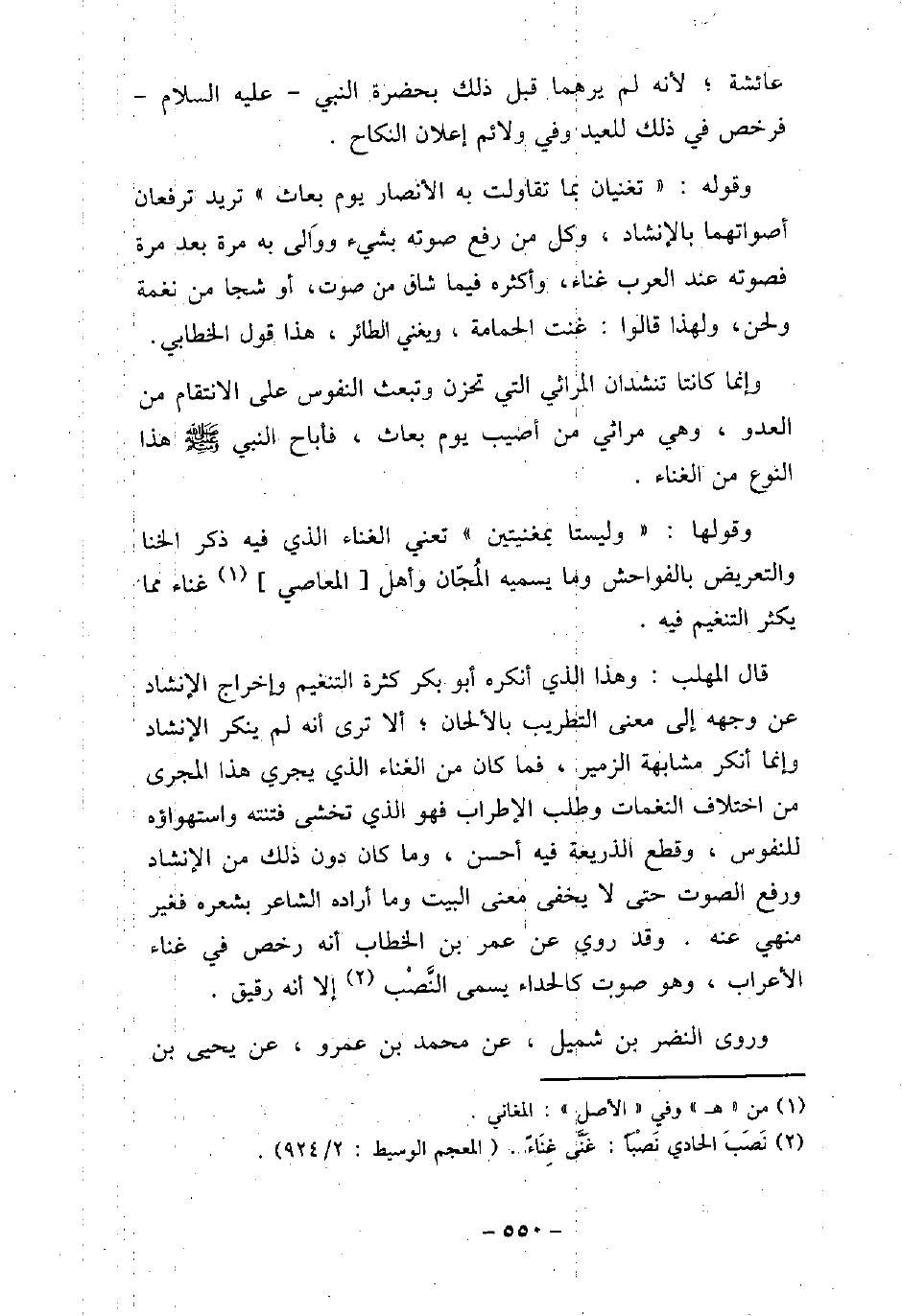 عائشة؛ لأنه لم يرهما قبل ذلك بحضرة النبى، عليه السلام، فرخص فى ذلك للعيد وفى ولائم إعلان النكاح. وقوله: (تغنيان بما تقاولت به الأنصار يوم بعاث) ، تريد ترفعان أصواتهما بالإنشاد، وكل من رفع صوته بشىء ووالى به مرة بعد مرة، فصوته عند العرب غناء، وأكثره فيما شاق من صوت، أو شجا من نغمة ولحن، ولهذا قالوا: غنت الحمامة، ويغنى الطائر، هذا قول الخطابى. وإنما كانتا تنشدان المراثى التى تحزن وتبعث النفوس على الاتنقام من العدو، وهى مراثى من أصيب يوم بعاث، فأباح النبى (صلى الله عليه وسلم) هذا النوع من الغناء. وقولها: (وليستا بمغنيتين) ، تعنى الغناء الذى فيه ذكر الخنا والتعريض بالفواحش وما يسميه المُجان وأهل المعاصى غناء مما يكثر التنغيم فيه. قال المهلب: وهذا الذى أنكره أبو بكر كثرة التنغيم وإخراج الإنشاد عن وجهه إلى معنى التطريب بالألحان؛ ألا ترى أنه لم ينكر الإنشاد وإنما أنكر مشابهة الزمير، فما كان من الغناء الذى يجرى هذا المجرى من اختلاف النغمات وطلب الإطراب فهو الذى تخشى فتنته واستهواؤه للنفوس، وقطع الذريعة فيه أحسن، وما كان دون ذلك من الإنشاد ورفع الصوت حتى لا يخفى معنى البيت، وما أراده الشاعر بشعره فغير منهى عنه، وقد روى عن عمر بن الخطاب أنه رخص فى غناء الأعراب، وهو صوت كالحداء يسمى النصب إلا أنه رقيق. وروى النضر بن شميل، عن محمد بن عمرو، عن يحيى بن