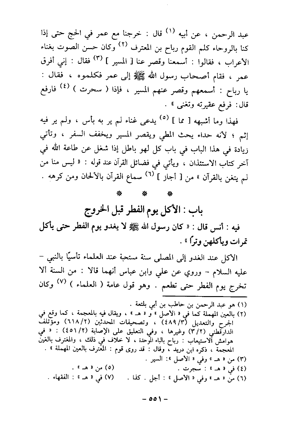 عبد الرحمن، عن أبيه، قال: خرجنا مع عمر فى الحج حتى إذا كنا بالروحاء كلم القوم رباح بن المعترف، وكان حسن الصوت بغناء الأعراب، فقالوا: أسمعنا وقصر عنا المسير فقال: إنى أفرق عمر، فقام أصحاب رسول الله (صلى الله عليه وسلم) إلى عمر فكلموه، فقال: يا رباح، أسمعهم وقصر عنهم المسير، فإذا سحرت فارفع قال: فرفع عقيرته وتغنى) . فهذا وما أشبهه مما يدعى غناء لم ير به بأس، ولم ير فيه إثم؛ لأنه حداء يحث المطى ويقصر المسير ويخفف السفر، وتأتى زيادة فى هذا الباب فى باب كل لهو باطل إذا شغل عن طاعة الله فى آخر كتاب الاستئذان، ويأتى فى فضائل القرآن عند قوله: (ليس منا من لم يتغن بالقرآن) ، من أجاز سماع القرآن بالألحان ومن كرهه.