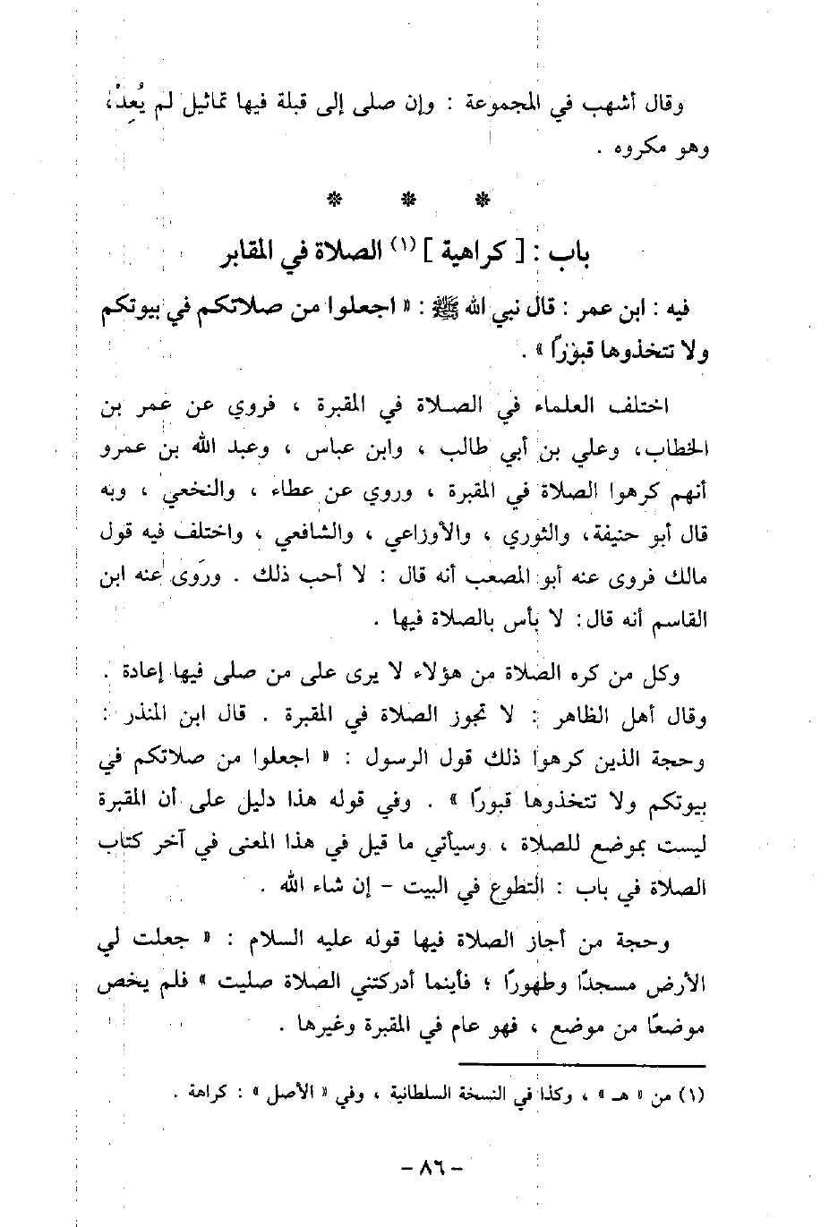 / 66 - فيه: ابن عمر: قال نَّبِيِّ الله (صلى الله عليه وسلم) : (اجْعَلُوا مِنْ صَلاتِكُمْ فِي بُيُوتِكُمْ، وَلا تَتَّخِذُوهَا قُبُورًا) . اختلف العلماء فى الصلاة فى المقبرة، فروى عن عمر بن الخطاب، وعلى بن أبى طالب، وابن عباس، وعبد الله بن عمرو أنهم كرهوا الصلاة فى المقبرة، وروى عن عطاء، والنخعى، وبه قال أبو حنيفة، والثورى، والأوزاعى، والشافعى، واختلف فيه قول مالك فروى عنه أبو المصعب أنه قال: لا أحب ذلك، وروى عنه ابن القاسم أنه قال: لا بأس بالصلاة فيها. وكل من كره الصلاة من هؤلاء لا يرى على من صلى فيها إعادة، وقال أهل الظاهر: لا تجوز الصلاة فى المقبرة، قال ابن المنذر: وحجة الذين كرهوا ذلك قول الرسول: (اجعلوا من صلاتكم فى بيوتكم ولا تتخذوها قبورًا) ، وفى قوله هذا دليل على أن المقبرة ليست بموضع للصلاة، وسيأتى ما قيل فى هذا المعنى فى آخر كتاب الصلاة فى باب: التطوع فى البيت، إن شاء الله. وحجة من أجاز الصلاة فيها قوله عليه السلام: (جعلت لى الأرض مسجدًا وطهورًا؛ فأينما أدركتنى الصلاة صليت) ، فلم يخص موضعًا من موضع، فهو عام فى المقبرة وغيرها.
