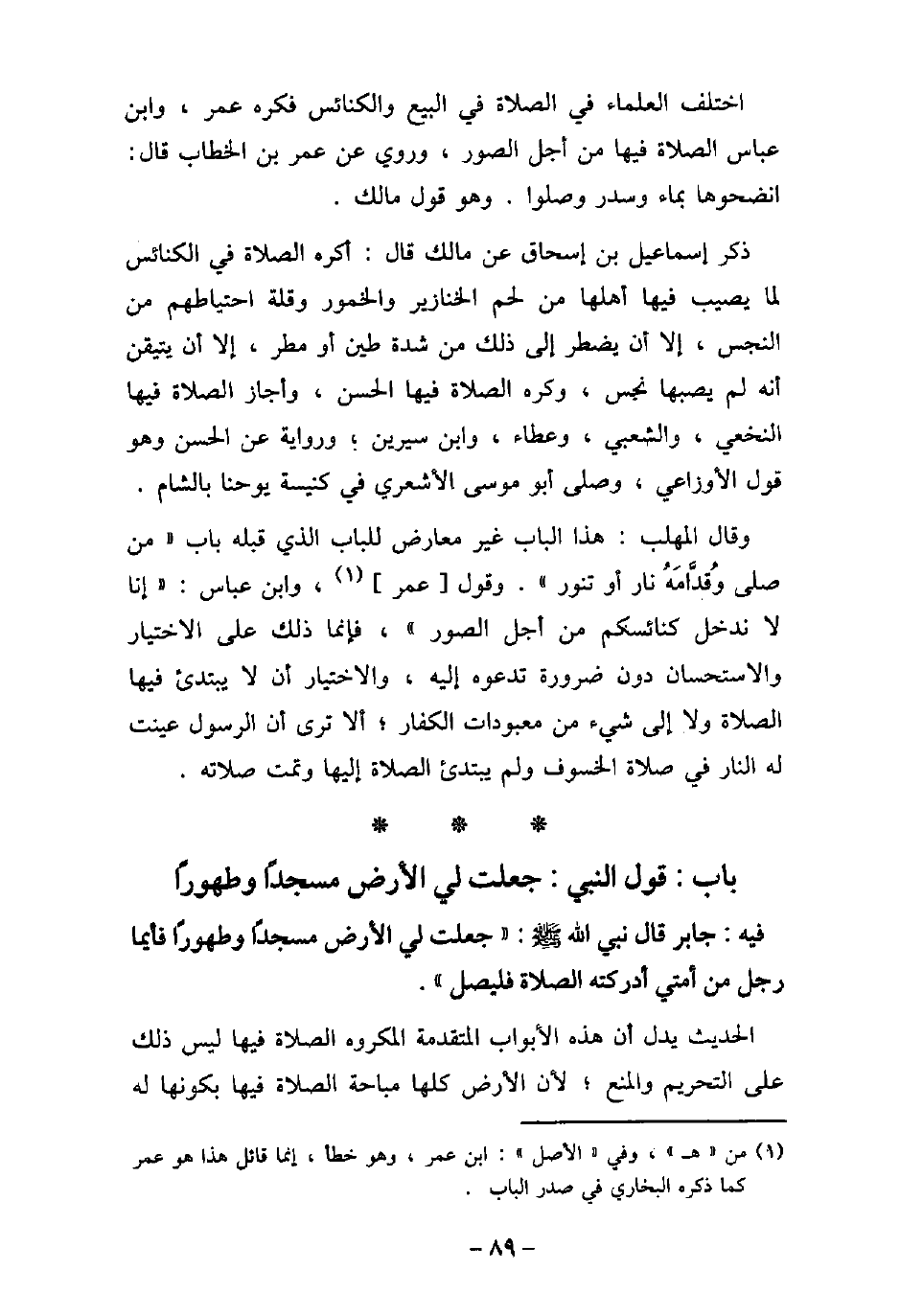 اختلف العلماء فى الصلاة فى البيع والكنائس فكره عمر، وابن عباس الصلاة فيها من أجل الصور، وروى عن عمر بن الخطاب قال: انضحوها بماء وسدر وصلوا، وهو قول مالك. ذكر إسماعيل بن إسحاق، عن مالك قال: أكره الصلاة فى الكنائس لما يصيب فيها أهلها من لحم الخنازير والخمور، وقلة احتياطهم من النجس، إلا أن يضطر إلى ذلك من شدة طين أو مطر، إلا أن يتيقن أنه لم يصبها نجس، وكره الصلاة فيها الحسن، وأجاز الصلاة فيها النخعى، والشعبى، وعطاء، وابن سيرين؛ ورواية عن الحسن وهو قول الأوزاعى، وصلى أبو موسى الأشعرى فى كنيسة يوحنا بالشام. وقال المهلب: هذا الباب غير معارض للباب الذى قبله باب: (من صلى وقُدَّامَهُ نار أو تنور) ، وقول عمر، وابن عباس: (إنا لا ندخل كنائسكم من أجل الصور) ، فإنما ذلك على الاختيار والاستحسان دون ضرورة تدعوه إليه، والاختيار أن لا يبتدئ فيها الصلاة ولا إلى شىء من معبودات الكفار؛ ألا ترى أن الرسول عينت له النار فى صلاة الخسوف ولم يبتدئ الصلاة إليها وتمت صلاته.