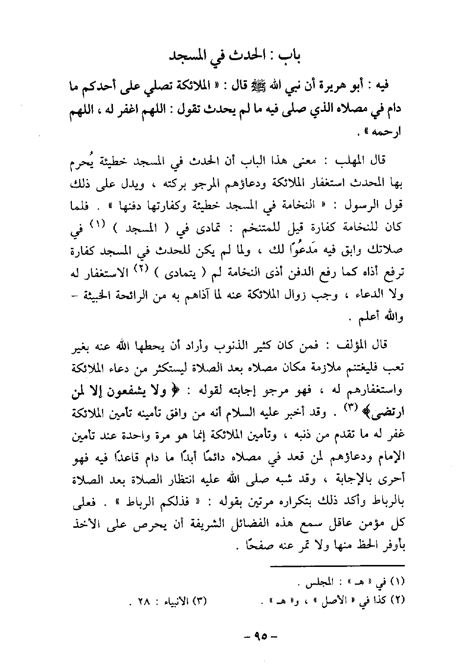 / 76 - فيه: أبو هريرة أن نبى الله (صلى الله عليه وسلم) قال: (الْمَلائِكَةُ تُصَلِّي عَلَى أَحَدِكُمْ مَا دَامَ فِي مُصَلاهُ الَّذِي صَلَّى فِيهِ، مَا لَمْ يُحْدِثْ، تَقُولُ: اللَّهُمَّ اغْفِرْ لَهُ، اللَّهُمَّ ارْحَمْهُ) . قال المهلب: معنى هذا الباب أن الحدث فى المسجد خطيئة يُحرم بها المحدث استغفار الملائكة ودعاؤهم المرجو بركته، ويدل على ذلك قول الرسول: (النخامة فى المسجد خطيئة وكفارتها دفنها) ، فلما كان للنخامة كفارة قيل للمتنخم: تمادى فى المسجد فى صلاتك وابق فيه مدعوًا لك، ولما لم يكن للحدث فى المسجد كفارة ترفع أذاه كما رفع الدفن أذى النخامة لم يتمادى الاستغفار له ولا الدعاء، وجب زوال الملائكة عنه لما آذاهم به من الرائحة الخبيثة، والله أعلم. قال المؤلف: فمن كان كثير الذنوب وأراد أن يحطها الله عنه بغير تعب فليغتنم ملازمة مكان مصلاه بعد الصلاة ليستكثر من دعاء الملائكة واستغفارهم له، فهو مرجو إجابته لقوله: (ولا يشفعون إلا لمن ارتضى) [الأنبياء: 28] ، وقد أخبر عليه السلام أنه من وافق تأمينه تأمين الملائكة غفر له ما تقدم من ذنبه، وتأمين الملائكة إنما هو مرة واحدة عند تأمين الإمام ودعاؤهم لمن قعد فى مصلاه دائمًا أبدًا ما دام قاعدًا فيه، فهو أحرى بالإجابة، وقد شبه (صلى الله عليه وسلم) انتظاهر الصلاة بعد الصلاة بالرباط وأكد ذلك بتكراره مرتين بقوله: (فذلكم الرباط) ، فعلى كل مؤمن عاقل سمع هذه الفضائل الشريفة أن يحرص على الأخذ بأوفر الحظ منها ولا تمر عنه صفحًا.