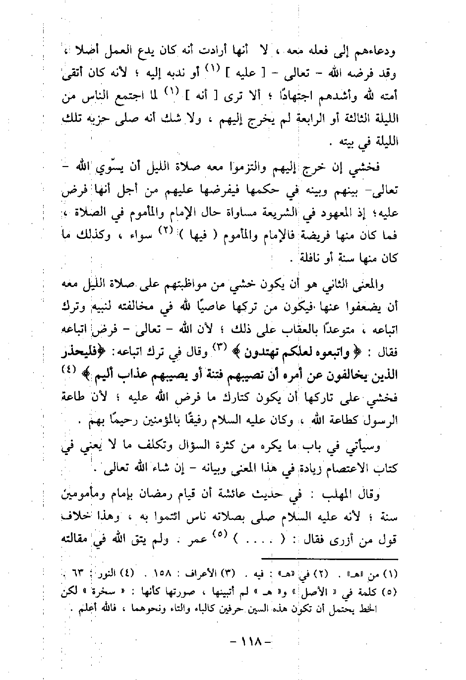 ودعاءهم إلى فعله معه، لا أنها أرادت أنه كان يدع العمل أصلاً، وقد فرضه الله تعالى عليه، أو ندبه إليه، لأنه كان أتقى أمته لله وأشدهم اجتهادًا، ألا ترى أنه لما اجتمع الناس من الليلة الثالثة، أو الرابعة لم يخرج إليهم، ولا شك أنه صلى حزبه تلك الليلة فى بيته. فخشى إن خرج إليهم والتزموا معه صلاة الليل أن يسّوى الله تعالى بينهم وبينه فى حكمها، فيفرضها عليهم من أجل أنها فرض عليه، إذ المعهود فى الشريعة مساواة حال الإمام والمأموم فى الصلاة، فما كان منها فريضة فالإمام والمأموم فيها سواء، وكذلك ما كان منها سنة أو نافلة. والمعنى الثانى هو أن يكون خشى من مواظبتهم على صلاة الليل معه أن يضعفوا عنها فيكون من تركها عاصيًا لله فى مخالفته لنبيه وترك اتباعه، متوعدًا بالعقاب على ذلك، لأن الله تعالى فرض اتباعه، فقال: (واتبعوه لعلكم تهتدون) [الأعراف: 158] ، وقال فى ترك اتباعه: (فليحذر الذين يخالفون عن أمره أن تصيبهم فتنة أو يصيبهم عذاب أليم) [النور: 63] ، فخشى على تاركها أن يكون كتارك ما فرض الله عليه، لأن طاعة الرسول (صلى الله عليه وسلم) كطاعة الله، وكان (صلى الله عليه وسلم) رفيقًا بالمؤمنين رحيمًا بهم. وسيأتى فى باب ما يكره من كثرة السؤال وتكلف ما لا يعنى فى كتاب الاعتصام زيادة فى هذا المعنى وبيانه، إن شاء الله تعالى. وقال المهلب: فى حديث عائشة أن قيام رمضان بإمام ومأمومين سنة، لأنه (صلى الله عليه وسلم) صلى بصلاته ناس ائتموا به، وهذا خلاف قول من أزرى فقال: [. . . .] عمر. ولم يتق الله فى مقالته،