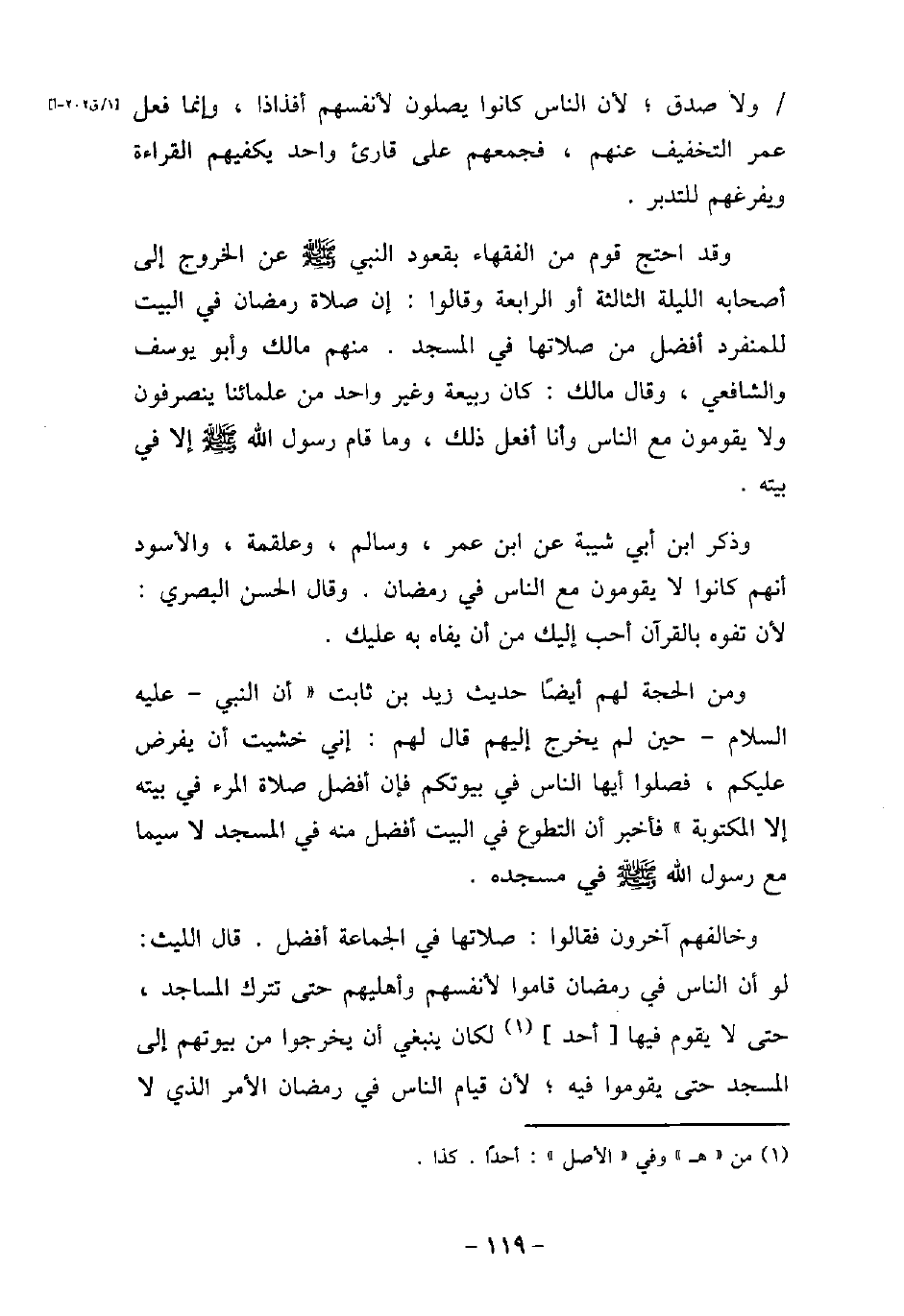 ولا صدق، لأن الناس كانوا يصلون لأنفسهم أفذاذًا، وإنما فعل عمر التخفيف عنهم، فجمعهم على قارئ واحد يكفيهم القراءة ويفرغهم للتدبر. وقد احتج قوم من الفقهاء بقعود النبى (صلى الله عليه وسلم) عن الخروج إلى أصحابه الليلة الثالثة، أو الرابعة، وقالوا: إن صلاة رمضان فى البيت للمنفرد أفضل من صلاتها فى المسجد، منهم مالك، وأبو يوسف، والشافعى، وقال مالك: كان ربيعة وغير واحد من علمائنا ينصرفون ولا يقومون مع الناس، وأنا أفعل ذلك، وما قام رسول الله (صلى الله عليه وسلم) إلا فى بيته. وذكر ابن أبى شيبة، عن ابن عمر، وسالم، وعلقمة، والأسود، أنهم كانوا لا يقومون مع الناس فى رمضان. وقال الحسن البصرى: لأن تفوه بالقرآن أحب إليك من أن يفاه به عليك. ومن الحجة لهم أيضًا حديث زيد بن ثابت: أن النبى، (صلى الله عليه وسلم) ، حين لم يخرج إليهم قال لهم: (إنى خشيت أن بفرض عليكم، فصلوا أيها الناس فى بيوتكم، فإن أفضل صلاة المرء فى بيته إلا المكتوبة) . فأخبر أن التطوع فى البيت أفضل منه فى المسجد لاسيما مع رسول الله (صلى الله عليه وسلم) فى مسجده. وخالفهم آخرون، فقالوا: صلاتها فى الجماعة أفضل. قال الليث: لو أن الناس فى رمضان قاموا لأنفسهم وأهليهم حتى تترك المساجد، حتى لا يقوم فيها أحد لكان ينبغى أن يخرجوا من بيوتهم إلى المسجد حتى يقوموا فيه، لأن قيام الناس فى رمضان الأمر الذى لا