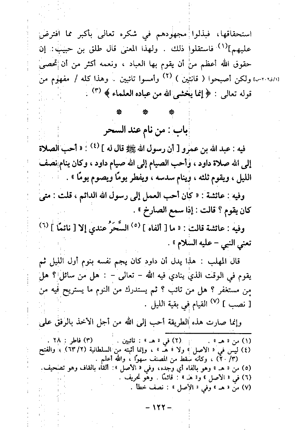 / 98 - فيه: عَبْدَاللَّهِ بْنَ عَمْرِو، أَنَّ رَسُولَ اللَّهِ (صلى الله عليه وسلم) قَالَ لَهُ: (أَحَبُّ الصَّلاةِ إِلَى اللَّهِ صَلاةُ دَاوُدَ، وَأَحَبُّ الصِّيَامِ إِلَى اللَّهِ صِيَامُ دَاوُدَ، وَكَانَ يَنَامُ نِصْفَ اللَّيْلِ، وَيَقُومُ ثُلُثَهُ وَيَنَامُ سُدُسَهُ، وَيَصُومُ يَوْمًا، وَيُفْطِرُ يَوْمًا) . / 99 - وفيه: عَائِشَةَ، كَانَ أَحَبَّ الْعَمَل إِلَى رسُول اللَّه (صلى الله عليه وسلم) الدَّائِمُ، قُلْتُ: مَتَى كَانَ يَقُومُ؟ قَالَتْ: إِذَا سَمِعَ الصَّارِخَ) . / 100 - وفيه: عَائِشَةَ، قَالَتْ: مَا أَلْفَاهُ السَّحَرُ عِنْدِى إِلا نَائِمًا، تَعْنِى النَّبِىَّ، (صلى الله عليه وسلم) . قال المهلب: هذا يدل أن دواد كان يجم نفسه بنوم أول الليل، ثم يقوم فى الوقت الذى ينادى فيه الله تعالى: هل من سائل؟ هل من مستغفر؟ هل من تائب؟ ثم يستدرك من النوم ما يستريح فيه من نصب القيام فى بقية الليل. وإنما صارت هذه الطريقة أحب إلى الله من أجل الأخذ بالرفق على