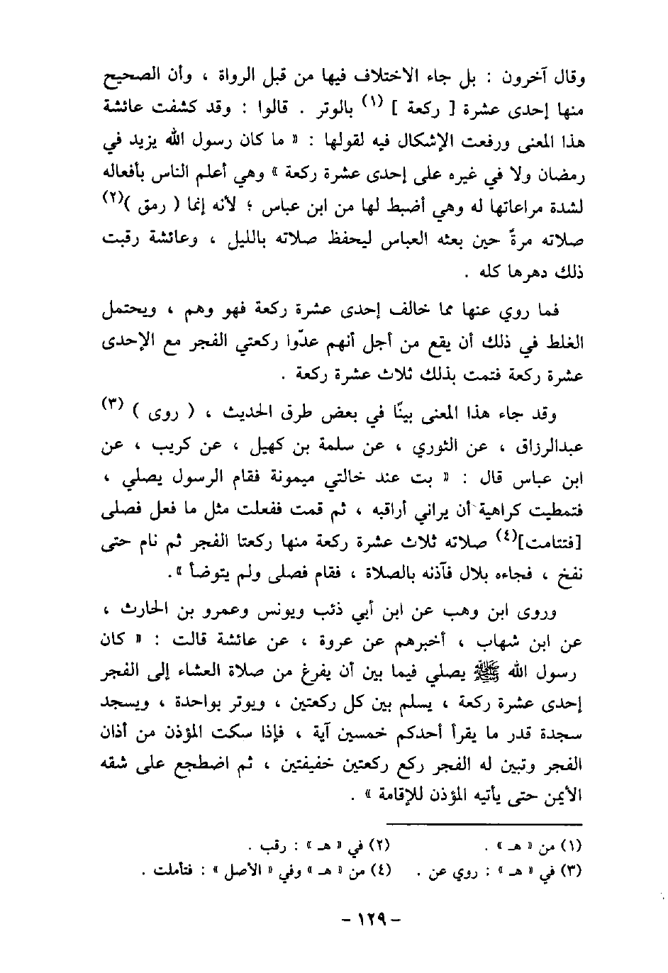وقال آخرون: بل جاء الاختلاف فيها من قبل الرواة، وأن الصحيح منها إحدى عشرة ركعة بالوتر. قالوا: وقد كشفت عائشة هذا المعنى ورفعت الإشكال فيه لقولها: (ما كان رسول الله (صلى الله عليه وسلم) يزيد فى رمضان ولا فى غيره على إحدى عشرة ركعة) ، وهى أعلم الناس بأفعاله لشدة مراعاتها له، وهى أضبط لها من ابن عباس، لأنه إنما رمق صلاته مرةً حين بعثه العباس ليحفظ صلاته بالليل، وعائشة رقبت ذلك دهرها كله. فما روى عنها مما خالف إحدى عشرة ركعة فهو وهم، ويحتمل الغلط فى ذلك أن يقع من أجل أنهم عدّوا ركعتى الفجر مع الإحدى عشرة ركعة، فتمت بذلك ثلاث عشرة ركعة. وقد جاء هذا المعنى بيانًا فى بعض طرق الحديث، روى عبد الرزاق، عن الثورى، عن سلمة بن كهيل، عن كريب، عن ابن عباس، قال: بت عند خالتى ميمونة، فقام الرسول (صلى الله عليه وسلم) يصلى، فتمطيت كراهية أن يرانى أراقبه، ثم قمت ففعلت مثل ما فعل فصلى فتتامت صلاته ثلاث عشرة ركعة منها ركعتا الفجر، ثم نام حتى نفخ، فجاءه بلال فآذنه بالصلاة، فقام فصلى ولم يتوضأ. وروى ابن وهب، عن ابن أبى ذئب، ويونس، وعمرو بن الحارث، عن ابن شهاب، أخبرهم عن عروة، عن عائشة، قالت: كان رسول الله (صلى الله عليه وسلم) يصلى فيما بين أن يفرغ من صلاة العشاء إلى الفجر إحدى عشرة ركعة، يسلم بين كل ركعتين، ويوتر بواحدة، ويسجد سجدة قدر ما يقرأ أحدكم خمسين آية، فإذا سكت المؤذن من أذان الفجر وتبين له الفجر ركع ركعتين خفيفتين، ثم اضطجع على شقه الأيمن حتى يأتيه المؤذن للإقامة.