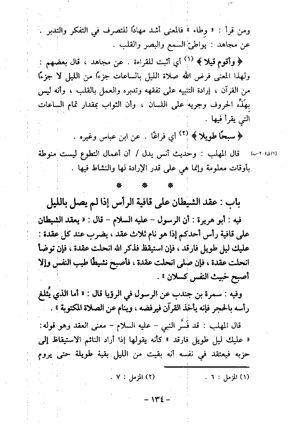/ 109 - فيه: أَبُو هُرَيْرَةَ، أَنَّ الرَسُولَ، (صلى الله عليه وسلم) ، قَالَ: (يَعْقِدُ الشَّيْطَانُ عَلَى قَافِيَةِ رَأْسِ أَحَدِكُمْ إِذَا هُوَ نَامَ ثَلاثَ عُقَدٍ، يَضْرِبُ عِنْدَ كُلَّ عُقْدَةٍ عَلَيْكَ لَيْلٌ طَوِيلٌ فَارْقُدْ، فَإِنِ اسْتَيْقَظَ فَذَكَرَ اللَّهَ انْحَلَّتْ عُقْدَةٌ، فَإِنْ تَوَضَّأَ انْحَلَّتْ عُقْدَةٌ، فَإِنْ صَلَّى انْحَلَّتْ عُقْدَةٌ، فَأَصْبَحَ نَشِيطًا طَيِّبَ النَّفْسِ، وَإِلا أَصْبَحَ خَبِيثَ النَّفْسِ كَسْلانَ) . / 110 - وفيه: سَمُرَةُ بْنُ جُنْدَبٍ عَنِ الرَسُولَ فِى الرُّؤْيَا قَالَ: (أَمَّا الَّذِى يُثْلَغُ رَأْسُهُ بِالْحَجَرِ، فَإِنَّهُ يَأْخُذُ الْقُرْآنَ فَيَرْفِضُهُ وَيَنَامُ عَنِ الصَّلاةِ الْمَكْتُوبَةِ) . قال المهلب: قد فسر النبى، (صلى الله عليه وسلم) ، معنى العقد وهو قوله: (عليك ليل طويل فارقد) كأنه يقولها إذا أراد النائم الاستيقاظ إلى حزبه فيعتقد فى نفسه أنه بقيت من الليل بقية طويلة حتى يروم