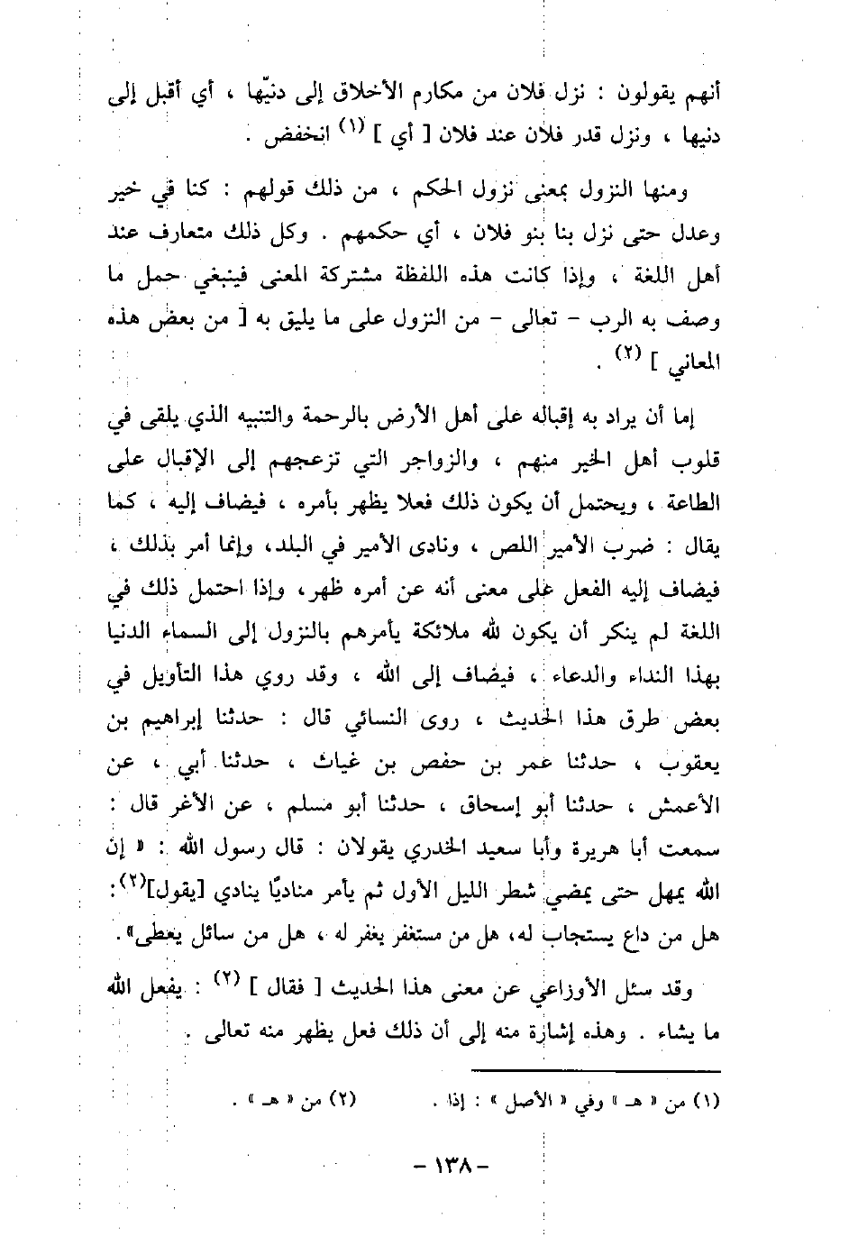 أنهم يقولون: نزل فلان من مكارم الأخلاق إلى دنيّها، أى أقبل إلى دنيها، ونزل قدر فلان عند فلان، أى انخفض. ومنها النزول بمعنى نزول الحكم، من ذلك قولهم: كنا فى خير وعدل حتى نزل بنا بنو فلان، أى حكمهم، وكل ذلك متعارف عند أهل اللغة، وإذا كانت هذه اللفظة مشتركة المعنى فينبغى حمل ما وصف به الرب تعالى من النزول على ما يليق به من بعض هذه المعانى. إما أن يراد به إقباله على أهل الأرض بالرحمة والتنبيه الذى يلقى فى قلوب أهل الخير منهم، والزواجر التى تزعجهم إلى الإقبال على الطاعة، ويحتمل أن يكون ذلك فعلا يظهر بأمره، فيضاف إليه، كما يقال: ضرب الأمير اللص، ونادى الأمير فى البلد، وإنما أمر بذلك، فيضاف إليه الفعل على معنى أنه عن أمره ظهر، وإذا احتمل ذلك فى اللغة لم ينكر أن يكون لله ملائكة يأمرهم بالنزول إلى السماء الدنيا بهذا النداء والدعاء، فيضاف إلى الله. وقد روى هذا التأويل فى بعض طرق هذا الحديث، روى النسائى، قال: حدثنا إبراهيم ابن يعقوب، حدثنا عمر بن حفص بن غياث، حدثنا أبى، عن الأعمش، حدثنا أبو إسحاق، حدثنا أبو مسلم، عن الأغر، قال: سمعت أبا هريرة، وأبا سعيد الخدرى يقولان: قال رسول الله (صلى الله عليه وسلم) : (إن الله يمهل حتى يمضى شطر الليل الأول، ثم يأمر مناديًا ينادى يقول: هل من داع يستجاب له، هل من مستغفر يغفر له، هل من سائل يعطى) . وقد سئل الأوزاعى عن معنى هذا الحديث، فقال: يفعل الله ما يشاء. وهذه إشارة منه إلى أن ذلك فعل يظهر منه تعالى.
