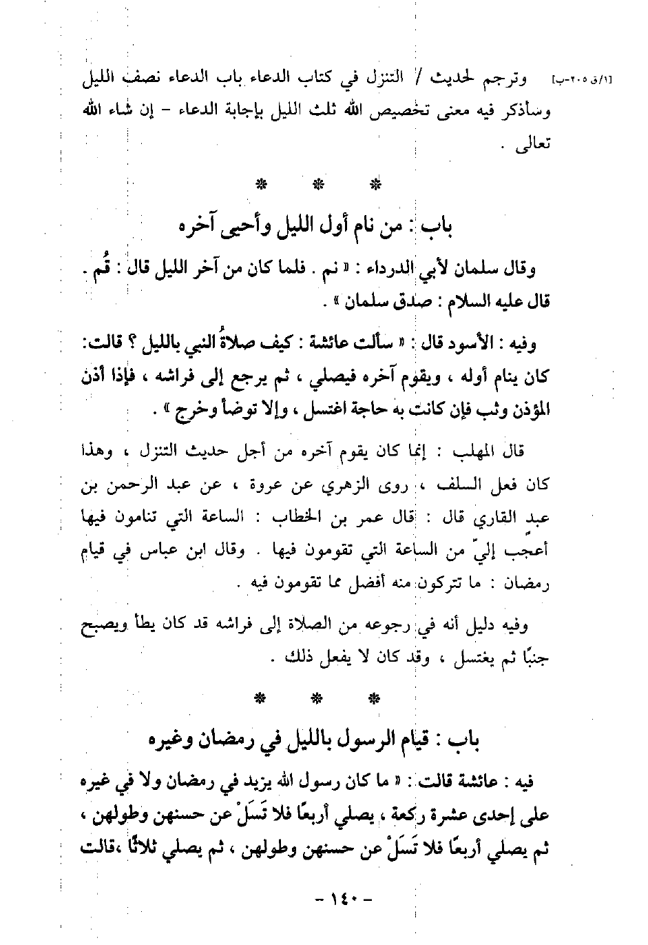 وَقَالَ سَلْمَانُ لأبِى الدَّرْدَاءِ: نَمْ، فَلَمَّا كَانَ مِنْ آخِرِ اللَّيْلِ، قَالَ: قُمْ، قَالَ (صلى الله عليه وسلم) : (صَدَقَ سَلْمَانُ) . / 113 - وفيه: الأسْوَدِ، قَالَ: سَأَلْتُ عَائِشَةَ كَيْفَ كَانَتْ صَلاةُ النَّبِىِّ (صلى الله عليه وسلم) بِاللَّيْلِ؟ قَالَتْ: كَانَ يَنَامُ أَوَّلَهُ، وَيَقُومُ آخِرَهُ فَيُصَلِّى، ثُمَّ يَرْجِعُ إِلَى فِرَاشِهِ، فَإِذَا أَذَّنَ الْمُؤَذِّنُ وَثَبَ، فَإِنْ كَانَت بِهِ حَاجَةٌ اغْتَسَلَ وَإِلا تَوَضَّأَ وَخَرَجَ. قال المهلب: إنما كان يقوم آخره من أجل حديث التنزل، وهذا كان فعل السلف، روى الزهرى، عن عروة، عن عبد الرحمن بن عبد القارى، قال: قال عمر بن الخطاب: الساعة التى تنامون فيها أعجب إلىّ من الساعة التى تقومون فيها. وقال ابن عباس فى قيام رمضان: ما تتركون منه أفضل مما تقومون فيه. وفيه: دليل أنه فى رجوعه من الصلاة إلى فراشه قد كان يطأ ويصبح جنبًا، ثم يغتسل، وقد كان لا يفعل ذلك.