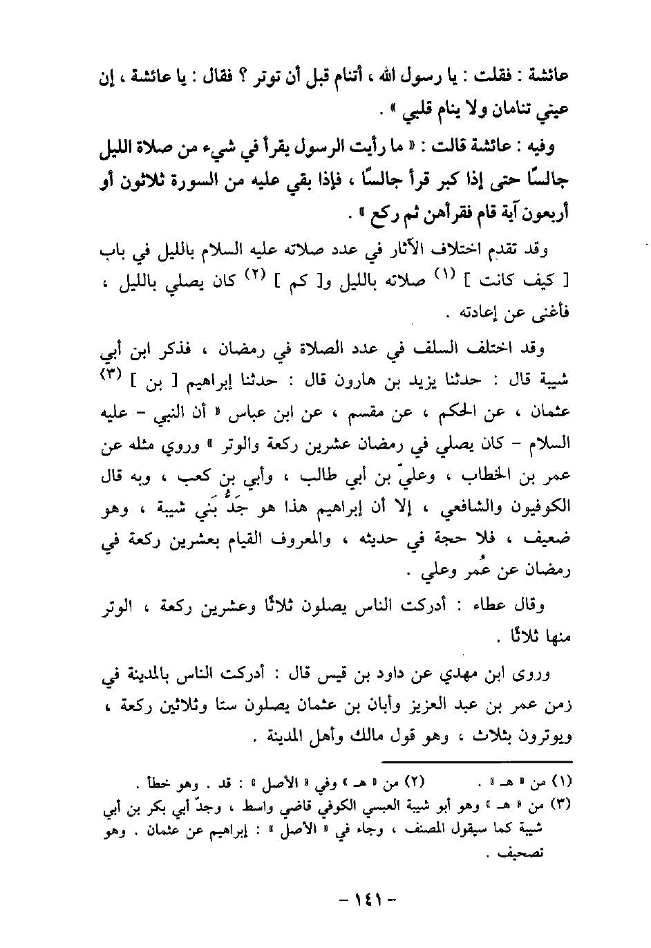 عَائِشَةُ: فَقُلْتُ: يَا رَسُولَ اللَّهِ أَتَنَامُ قَبْلَ أَنْ تُوتِرَ؟ فَقَالَ: (يَا عَائِشَةُ، إِنَّ عَيْنَىَّ تَنَامَانِ، وَلا يَنَامُ قَلْبِى) . / 115 - وفيه: عَائِشَةَ، قَالَتْ: مَا رَأَيْتُ الرسول (صلى الله عليه وسلم) يَقْرَأُ فِى شَىْءٍ مِنْ صَلاةِ اللَّيْلِ جَالِسًا، حَتَّى إِذَا كَبِرَ قَرَأَ جَالِسًا، فَإِذَا بَقِىَ عَلَيْهِ مِنَ السُّورَةِ ثَلاثُونَ أَوْ أَرْبَعُونَ آيَةً، قَامَ فَقَرَأَهُنّ، َ ثُمَّ رَكَعَ. وقد تقدم اختلاف الآثار فى عدد صلاته (صلى الله عليه وسلم) بالليل فى باب كيف كانت صلاته بالليل، وكم كان يصلى بالليل، فأغنى عن إعادته. وقد اختلف السلف فى عدد الصلاة فى رمضان، فذكر ابن أبى شيبة، قال: حدثنا يزيد ابن هارون، قال: حدثنا إبراهيم بن عثمان، عن الحكم، عن مقسم، عن ابن عباس، أن النبى، (صلى الله عليه وسلم) ، كان يصلى فى رمضان عشرين ركعة والوتر، وروى مثله عن عمر بن الخطاب، وعلى بن أبى طالب، وأبى بن كعب، وبه قال: الكوفيون والشافعى، إلا أن إبراهيم هذا هو جد بنى شيبة، وهو ضعيف، فلا حجة فى حديثه، والمعروف القيام بعشرين ركعة فى رمضان عن عمر وعلى. وقال عطاء: أدركت الناس يصلون ثلاثًا وعشرين ركعة، الوتر منها ثلاثًا. وروى ابن مهدى عن داود بن قيس، قال: أدركت الناس بالمدينة فى زمن عمر بن عبد العزيز، وأبان بن عثمان يصلون ستا وثلاثين ركعة، ويوترون بثلاث، وهو قول مالك وأهل المدينة.