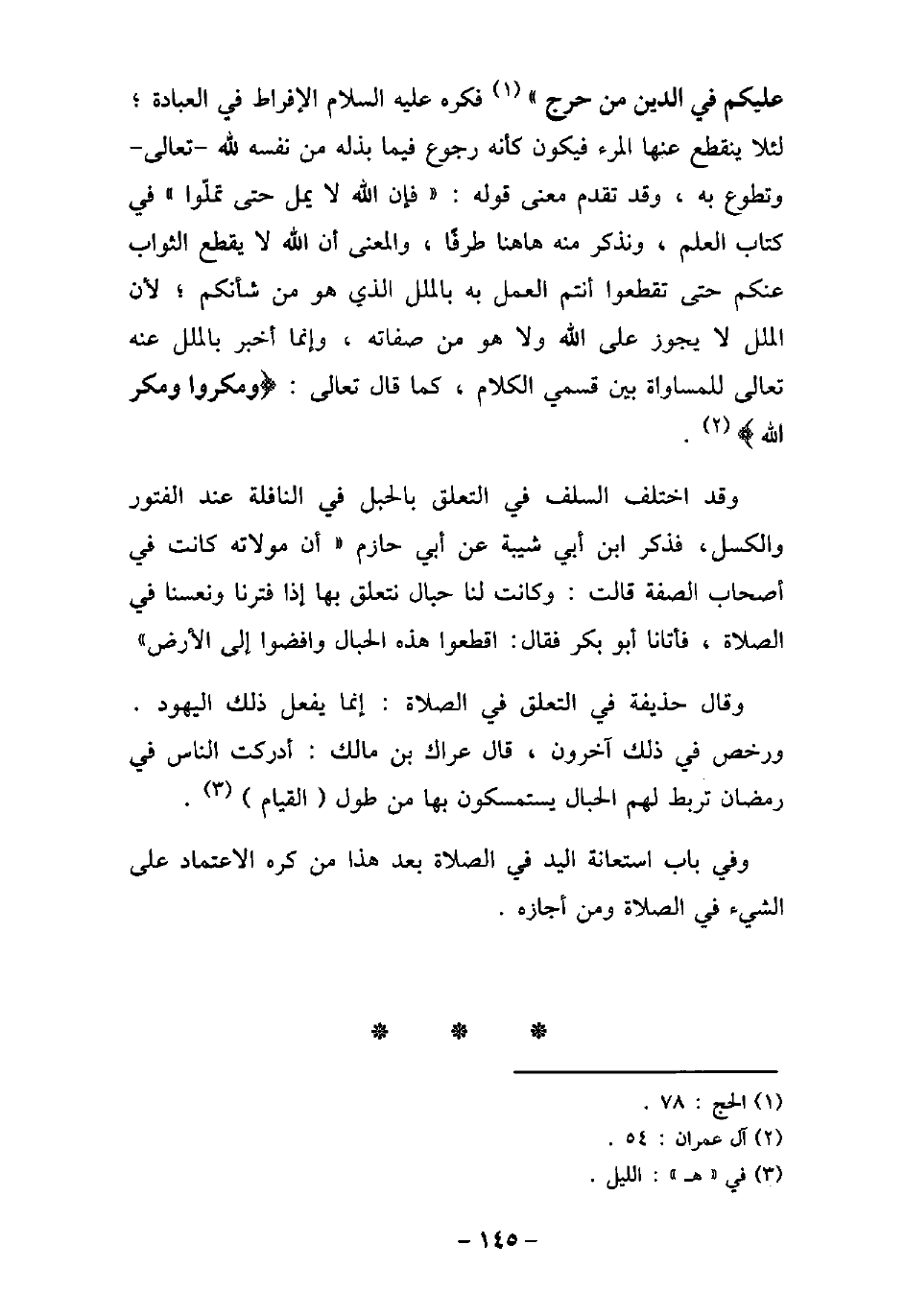 عليكم فى الدين من حرج) [الحج: 78] فكره (صلى الله عليه وسلم) الإفراط فى العبادة، لئلا ينقطع عنها المرء فيكون كأنه رجوع فيما بذله من نفسه لله، تعالى، وتطوع به، وقد تقدم معنى قوله: (فإن الله لا يمل حتى تملوا) فى كتاب العلم، ونذكر منه هاهنا طرفًا، والمعنى أن الله لا يقطع الثواب عنكم حتى تقطعوا أنتم العمل به بالملل الذى هو من شأنكم، لأن الملل لا يجوز على الله ولا هو من صفاته، وإنما أخبر بالملل عنه تعالى للمساواة بين قسمى الكلام، كما قال تعالى: (ومكروا ومكر الله) [آل عمران: 54] . وقد اختلف السلف فى التعلق بالحبل فى النافلة عند الفتور والكسل، فذكر ابن أبى شيبة عن أبى حازم: أن مولاته كانت فى أصحاب الصفة قالت: وكانت لنا حبال نتعلق بها إذا فترنا ونعسنا فى الصلاة، فأتانا أبو بكر فقال: اقطعوا هذه الحبال وافضوا إلى الأرض. وقال حذيفة فى التعلق فى الصلاة: إنما يفعل ذلك اليهود، ورخص فى ذلك آخرون، قال عراك بن مالك: أدركت الناس فى رمضان تربط لهم الحبال يستمسكون بها من طول القيام. وفى باب استعانة اليد فى الصلاة بعد هذا من كره الاعتماد على الشىء فى الصلاة ومن أجازه