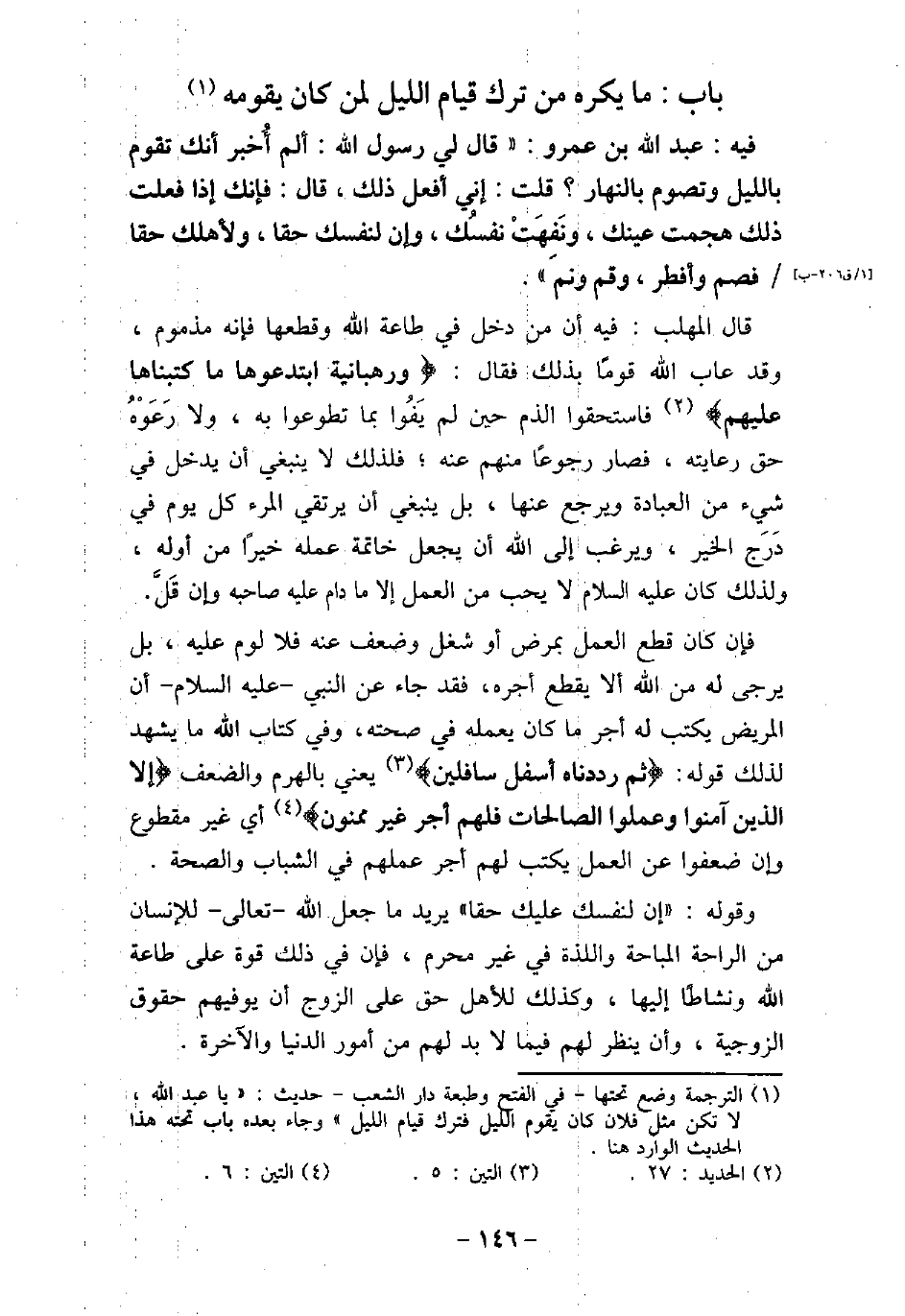 / 119 - فيه: عَبْدُ اللَّه بْنُ عَمْرِو، قَالَ لِى رَسُولُ اللَّهِ: (أَلَمْ أُخْبَرْ أَنَّكَ تَقُومُ باللَّيْلِ وَتَصُومُ بالنَّهَارِ؟) ، قُلْتُ: إِنِّى أَفْعَلُ ذَلِكَ، قَالَ: (فَإِنَّكَ إِذَا فَعَلْتَ ذَلِكَ هَجَمَتْ عَيْنُكَ، وَنَفِهَتْ نَفْسُكَ، وَإِنَّ لِنَفْسِكَ حَقًّا، وَلأهْلِكَ حَقًّا، فَصُمْ وَأَفْطِرْ، وَقُمْ وَنَمْ) . قال المهلب: فيه أن من دخل فى طاعة الله وقطعها فإنه مذموم، وقد عاب الله قومًا بذلك فقال: (ورهبانية ابتدعوها ما كتبناها عليهم) [الحديد: 27] فاستحقوا الذم حين لم يفوا بما تطوعوا به، ولا رعوه حق رعايته، فصار رجوعًا منهم عنه، فلذلك لا ينبغى أن يدخل فى شىء من العبادة ويرجع عنها، بل ينبغى أن يرتقى المرء كل يوم فى درج الخير، ويرغب إلى الله أن يجعل خاتمة عمله خيرًا من أوله، ولذلك كان (صلى الله عليه وسلم) لا يحب من العمل إلا ما دام عليه صاحبه وإن قل. فإن كان قطع العمل بمرض أو شغل وضعف عنه فلا لوم عليه، بل يرجى له من الله ألا يقطع أجره، فقد جاء عن النبى، (صلى الله عليه وسلم) ، أن المريض يكتب له أجر ما كان يعمله فى صحته، وفى كتاب الله ما يشهد لذلك قوله: (ثم رددناه أسفل سافلين) [التين: 5] ، يعنى بالهرم والضعف) إلا الذين آمنوا وعملوا الصالحات فلهم أجر غير ممنون) [التين: 6] ، أى غير مقطوع وإن ضعفوا عن العمل يكتب لهم أجر عملهم فى الشباب والصحة. وقوله: (إن لنفسك عليك حقًا) يريد ما جعل الله، تعالى، للإنسان من الراحة المباحة واللذة فى غير محرم، فإن فى ذلك قوة على طاعة الله ونشاطًا إليها، وكذلك للأهل حق على الزوج أن يوفيهم حقوق الزوجية، وأن ينظر لهم فيما لابد لهم من أمور الدنيا والآخرة.