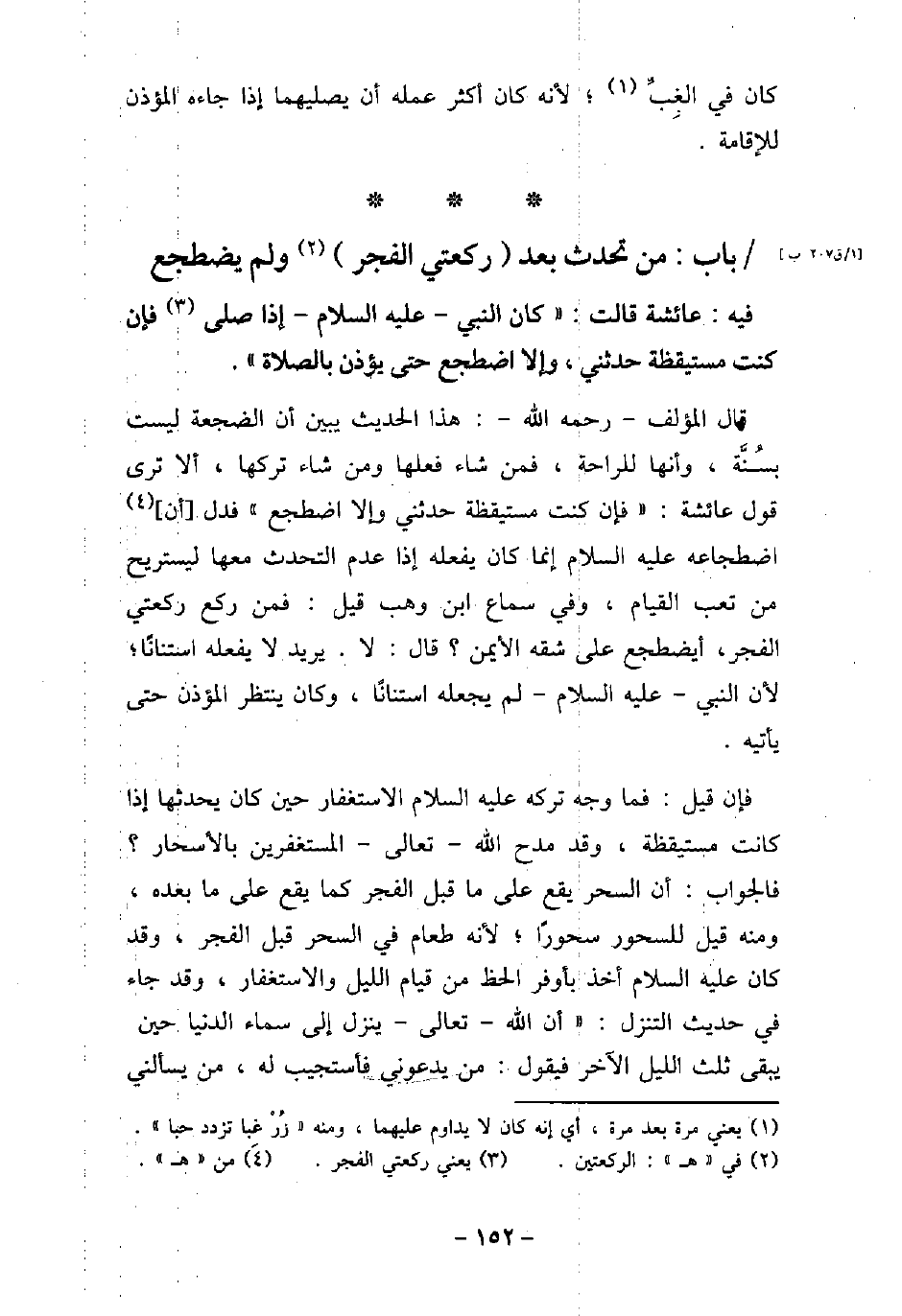 / 125 - فيه: عَائِشَةَ، قَالَتْ: كَانَ النَّبِىِّ، (صلى الله عليه وسلم) ، إِذَا صَلَّى، فَإِنْ كُنْتُ مُسْتَيْقِظَةً حَدَّثَنِى، وَإِلا اضْطَجَعَ حَتَّى يُؤْذَنَ بِالصَّلاةِ. قال المؤلف، رحمه الله: هذا الحديث يبين أن الضجعة ليست بسُنَّة، وأنها للراحة، فمن شاء فعلها ومن شاء تركها، ألا ترى قول عائشة: فإن كنت مستيقظة حدثنى وإلا اضطجع، فدل أن اضطجاعه (صلى الله عليه وسلم) إنما كان يفعله إذا عدم التحدث معها ليستريح من تعب القيام، وفى سماع ابن وهب قيل: فمن ركع ركعتى الفجر، أيضطجع على شقه الأيمن؟ قال: لا، يريد لا يفعله استنانًا، لأن النبى، (صلى الله عليه وسلم) ، لم يجعله استنانًا، وكان ينتظر المؤذن حتى يأتيه. فإن قيل: فما وجه تركه (صلى الله عليه وسلم) الاستغفار حين كان يحدثها إذا كانت مستيقظة، وقد مدح الله، تعالى، المستغفرين بالأسحار؟ . فالجواب: أن السحر يقع على ما قبل الفجر كما يقع على ما بعده ومنه قيل للسحور سحورًا، لأنه طعام فى السحر قبل الفجر، وقد كان (صلى الله عليه وسلم) أخذ بأوفر الحظ من قيام الليل والاستغفار، وقد جاء فى حديث التنزيل: (أن الله، تعالى، ينزل إلى سماء الدنيا حين يبقى ثلث الليل الآخر فيقول: من يدعونى فأستجيب له، من يسألنى