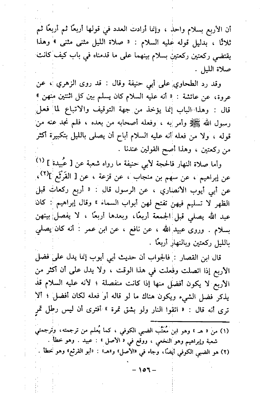 أن الأربع بسلام واحد، وإنما أرادت العدد فى قولها أربعًا، ثم أربعًا، ثم ثلاثًا، بدليل قوله (صلى الله عليه وسلم) : (صلاة الليل مثنى مثنى) وهذا يقتضى ركعتين ركعتين بسلام بينهما على ما قدمناه فى باب كيف كانت صلاة الليل. وقد رد الطحاوى على أبى حنيفة، وقال: قد روى الزهرى، عن عروة، عن عائشة، أنه (صلى الله عليه وسلم) كان يسلم بين كل اثنتين منهن، قال: وهذا الباب إنما يؤخذ من جهة التوقيف والاتباع لما فعل رسول الله (صلى الله عليه وسلم) وأمر به، وفعله أصحابه من بعده، فلم نجد عنه من قوله، ولا من فعله أنه (صلى الله عليه وسلم) أباح أن يصلى بالليل بتكبيرة أكثر من ركعتين، وهذا أصح القولين عندنا. وأما صلاة النهار فالحجة لأبى حنيفة ما رواه شعبة، عن عبيدة، عن إبراهيم، عن سهم ابن منجاب، عن قزعة، عن القَرْثَع، عن أبى أيوب الأنصارى، عن الرسول، قال: (أربع ركعات قبل الظهر لا تسليم فيهن تفتح لهن أبواب السماء) وقال إبراهيم: كان عبد الله يصلى قبل الجمعة أربعًا، وبعدها أربعًا، لا يفصل بينهن بسلام. وروى عبيد الله، عن نافع، عن ابن عمر، أنه كان يصلى بالليل ركعتين وبالنهار أربعًا. قال ابن القصار: فالجواب أن حديث أبى أيوب إنما يدل على فضل الأربع إذا اتصلت وفعلت فى هذا الوقت، ولا يدل على أن أكثر من الأربع لا يكون أفضل منها إذا كانت منفصلة، لأنه (صلى الله عليه وسلم) قد يذكر فضل الشىء ويكون هناك ما لو قاله أو فعله لكان أفضل، ألا ترى أنه قال: (اتقوا النار ولو بشق تمرة) أفترى أن ليس رطل تمرٍ