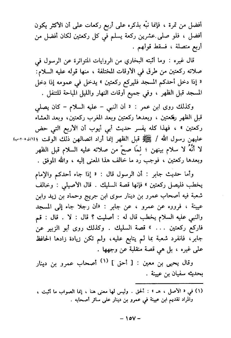 أفضل من تمرة، فإنما نبّه بذكره على أربع ركعات على أن الأكثر يكون أفضل، فلو صلى عشرين ركعة يسلم فى كل ركعتين لكان أفضل من أربع متصلة، فسقط قولهم. قال غيره: وما أثبته البخارى من الروايات المتواترة عن الرسول فى صلاته ركعتين من طرق فى الأوقات المختلفة، منها قوله (صلى الله عليه وسلم) : (إذا دخل أحدكم المسجد فليركع ركعتين) يدخل فى عمومه إذا دخل المسجد قبل الظهر، وفى جميع أوقات النهار والليل المباحة للتنفل. وكذلك روى ابن عمر، أن النبى، (صلى الله عليه وسلم) ، كان يصلى قبل الظهر ركعتين، وبعدها ركعتين وبعد المغرب ركعتين، وبعد العشاء ركعتين، فهذا كله يفسر حديث أبى أيوب أن الأربع التى حض عليهن رسول الله (صلى الله عليه وسلم) قبل الظهر إنما أراد اتصالهن ذلك الوقت، لا أَنَّهُ لا سلام بينهن، لما صح من صلاته (صلى الله عليه وسلم) قبل الظهر وبعدها ركعتين، فوجب رد ما خالف هذا المعنى إليه، والله الموفق. وأما حديث جابر أن الرسول، قال: (إذا جاء أحدكم والإمام يخطب فليصل ركعتين) فإنها قصة السليك. قال الأصيلى: وخالف شعبة فيه أصحاب عمرو بن دينار سوى ابن جريج وحماد بن زيد وابن عيينة، فرووه عن عمرو، عن جابر، أن رجلا جاء إلى المسجد والنبى، (صلى الله عليه وسلم) ، يخطب قال له: (أصليت) ؟ قال: لا، قال: (قم فاركع ركعتين) قصة السليك، وكذلك روى أبو الزبير عن جابر، فانفرد شعبة بما لم يتابع عليه، ولم تكن زيادة زادها الحافظ على غيره، بل هى قصة منقلبة عن وجهها. وقال يحيى بن معين: أحق أصحاب عمرو بن دينار بحديثه سفيان بن عيينة.