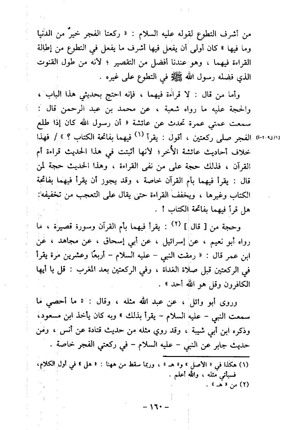 من أشرف التطوع، لقوله (صلى الله عليه وسلم) : (ركعتا الفجر خيرٌ من الدنيا وما فيها) كان أولى أن يفعل فيها أشرف ما يفعل فى التطوع من إطالة القراءة فيهما، وهو عندنا أفضل من التقصير، لأنه من طول القنوت الذى فضله رسول الله (صلى الله عليه وسلم) فى التطوع على غيره. وأما من قال: لا قراءة فيهما، فإنه احتج بحديثى هذا الباب، والحجة عليه ما رواه شعبة، عن محمد بن عبد الرحمن، قال: سمعت عمتى عمرة تحدث عن عائشة، أن رسول الله كان إذا طلع الفجر صلى ركعتين، أقول: يقرأ فيهما بفاتحة الكتاب؟ فهذا خلاف أحاديث عائشة الأُخر، لأنها أثبتت فى هذا الحديث قراءة أم القرآن، فذلك حجة على من نفى القراءة، وهذا الحديث حجة لمن قال: يقرأ فيهما بأم القرآن خاصة، وقد يجوز أن يقرأ فيهما بفاتحة الكتاب وغيرها، ويخفف القراءة حتى يقال على التعجب من تخفيفه: هل قرأ فيهما بفاتحة الكتاب. وحجة من قال: يقرأ فيهما بأم القرآن وسورة قصيرة، ما رواه أبو نعيم، عن إسرائيل، عن أبى إسحاق، عن مجاهد، عن ابن عمر، قال: رمقت النبى، (صلى الله عليه وسلم) ، أربعًا وعشرين مرة يقرأ فى الركعتين قبل صلاة الغداة، وفى الركعتين بعد المغرب: (قل يا أيها الكافر (، و) قل هو الله أحد (. وروى أبو وائل، عن عبد الله مثله، وقال: ما أحصى ما سمعت النبى، (صلى الله عليه وسلم) ، يقرأ بذلك، وبه كان يأخذ ابن مسعود وذكره ابن أبى شيبة، وقد روى مثله من حديث قتادة عن أنس، ومن حديث جابر، عن النبى، (صلى الله عليه وسلم) ، فى ركعتى الفجر خاصة.