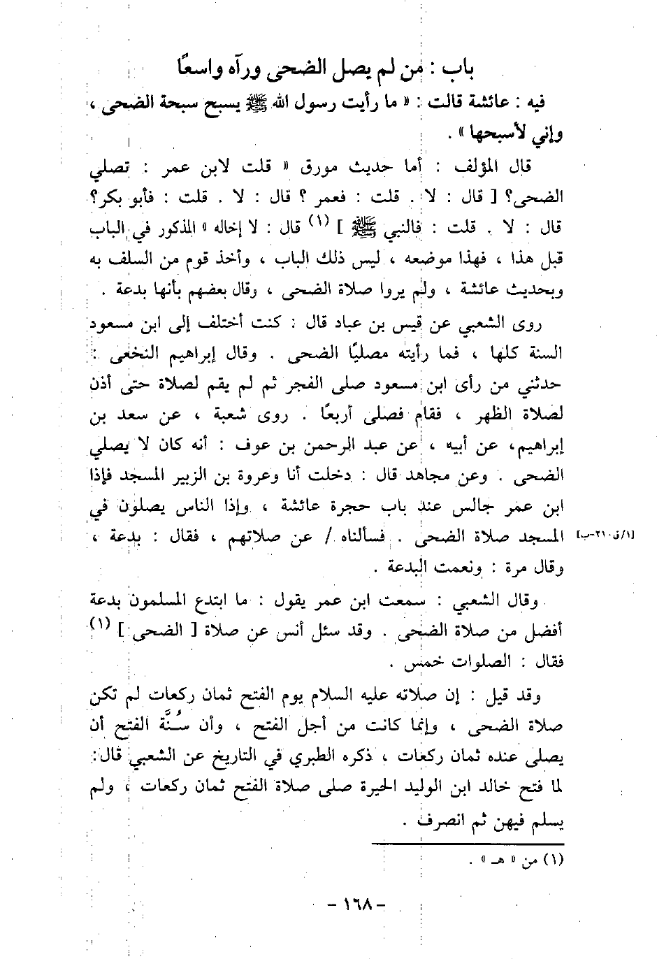 / 139 - فيه: عَائِشَةَ، قَالَتْ: مَا رَأَيْتُ رَسُولَ اللَّهِ (صلى الله عليه وسلم) يسَبَّحَ سُبْحَةَ الضُّحَى، وَإِنِّى لأسَبِّحُهَا. قال المؤلف: أما حديث مورق: قلت لابن عمر: تصلى الضحى؟ قال: لا، قلت: فعمر؟ قال: لا، قلت: فأبو بكر؟ قال: لا، قلت: فالنبى (صلى الله عليه وسلم) ؟ قال: لا، إخاله المذكور فى الباب قبل هذا، فهذا موضعه، ليس ذلك الباب، وأخذ قوم من السلف به وبحديث عائشة، ولم يروا صلاة الضحى، وقال بعضهم: بأنها بدعة. روى الشعبى، عن قيس بن عباد، قال: كنت أختلف إلى ابن مسعود السنة كلها، فما رأيته مصليًا الضحى. وقال إبراهيم النخعى: حدثنى من رأى ابن مسعود صلى الفجر، ثم لم يقم لصلاة حتى أذن لصلاة الظهر، فقام فصلى أربعًا. روى شعبة، عن سعد بن إبراهيم، عن أبيه، عن عبد الرحمن بن عوف: أنه كان لا يصلى الضحى. وعن مجاهد، قال: دخلت أنا وعروة بن الزبير المسجد فإذا ابن عمر جالس عند باب حجرة عائشة، وإذا الناس يصلون فى المسجد صلاة الضحى، فسألناه عن صلاتهم، فقال: بدعة، وقال مرة: ونعمت البدعة. وقال الشعبى: سمعت ابن عمر يقول: ما ابتدع المسلمون بدعة أفضل من صلاة الضحى، وقد سئل أنس عن صلاة الضحى، فقال: الصلوات خمس. وقد قيل: إن صلاته (صلى الله عليه وسلم) يوم الفتح ثمان ركعات لم تكن صلاة الضحى، وإنما كانت من أجل الفتح، وأن سُنَّة الفتح أن يصلى عنده ثمان ركعات، ذكره الطبرى فى التاريخ عن الشعبى، قال: لما فتح خالد بن الوليد الحيرة صلى صلاة الفتح ثمان ركعات، ولم يسلم فيهن، ثم انصرف.