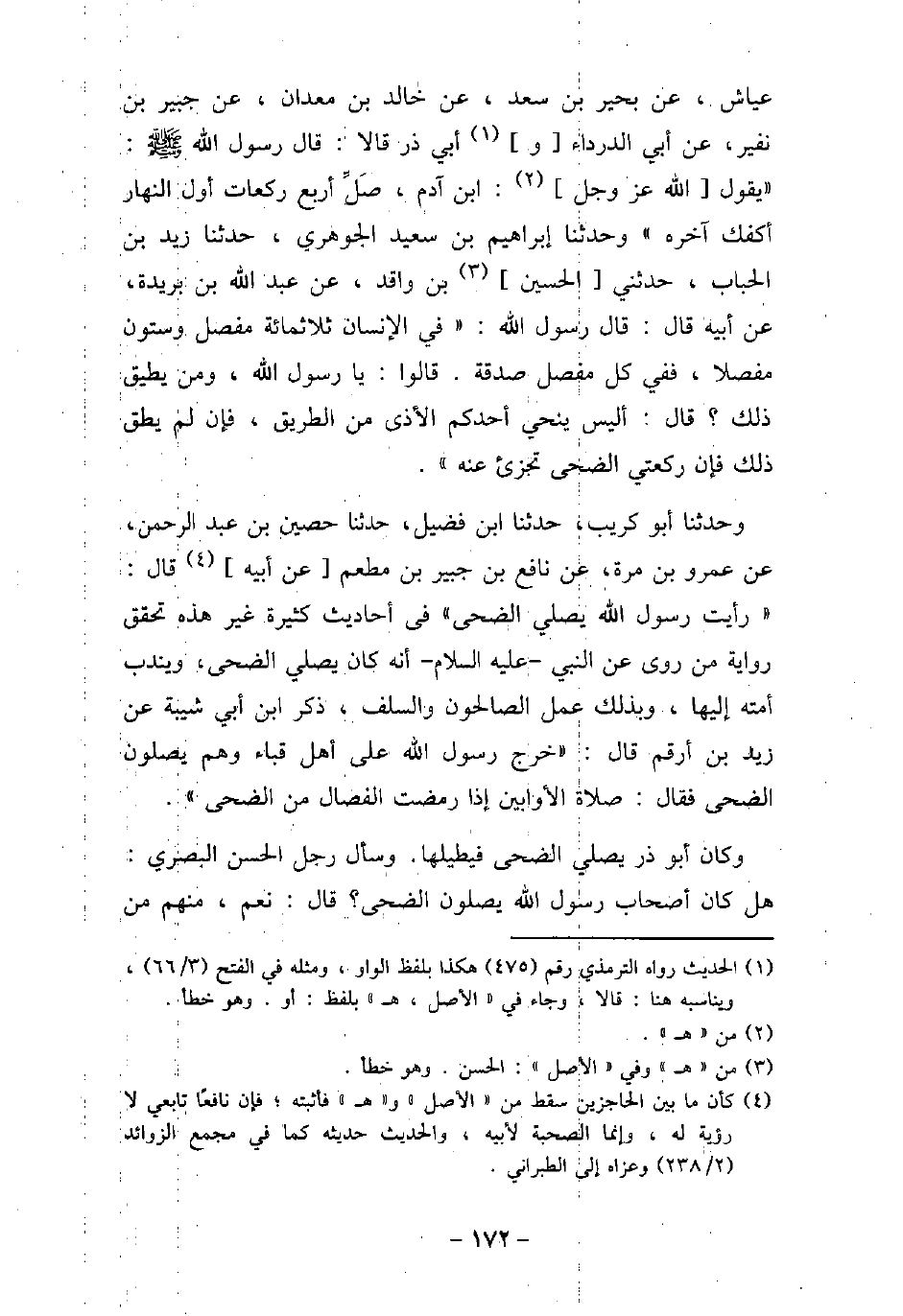 عياش، عن بحير ابن سعد، عن خالد بن معدان، عن جبير بن نفير، عن أبى الدرداء، وأبى ذر قالا: قال رسول الله (صلى الله عليه وسلم) : (يقول الله عز وجل: ابن آدم، صَلِّ أربع ركعات أول النهار أكفك آخره) . وحدثنا إبراهيم بن سعيد الجوهرى، حدثنا زيد بن الحباب، حدثنى الحسين بن واقد، عن عبد الله بن بريدة، عن أبيه، قال: قال رسول الله (صلى الله عليه وسلم) : (فى الإنسان ثلاث مائة مفصل، وستون مفصلاً ففى كل مفصل صدقة) . قالوا: يا رسول الله، ومن يطيق ذلك؟ قال: (أليس ينحى أحدكم الأذى من الطريق، فإن لم يطق ذلك، فإن ركعتى الضحى تجزئ عنه) . وحدثنا أبو كريب، حدثنا ابن فضيل، حدثنا حصين بن عبد الرحمن، عن عمرو بن مرة، عن نافع بن جبير بن مطعم، عن أبيه، قال: رأيت رسول الله (صلى الله عليه وسلم) يصلى الضحى. فى أحاديث كثيرة غير هذه تحقق رواية من روى عن النبى، (صلى الله عليه وسلم) ، أنه كان يصلى الضحى، ويندب أمته إليها، وبذلك عمل الصالحون والسلف، ذكر ابن أبى شيبة، عن زيد بن أرقم، قال: خرج رسول الله (صلى الله عليه وسلم) على أهل قباء وهم يصلون الضحى، فقال: (صلاة الأوابين إذا رمضت الفصال من الضحى) . وكان أبو ذر يصلى الضحى فيطيلها. وسأل رجل الحسن البصرى هل كان أصحاب رسول الله (صلى الله عليه وسلم) يصلون الضحى؟ قال: نعم، منهم من