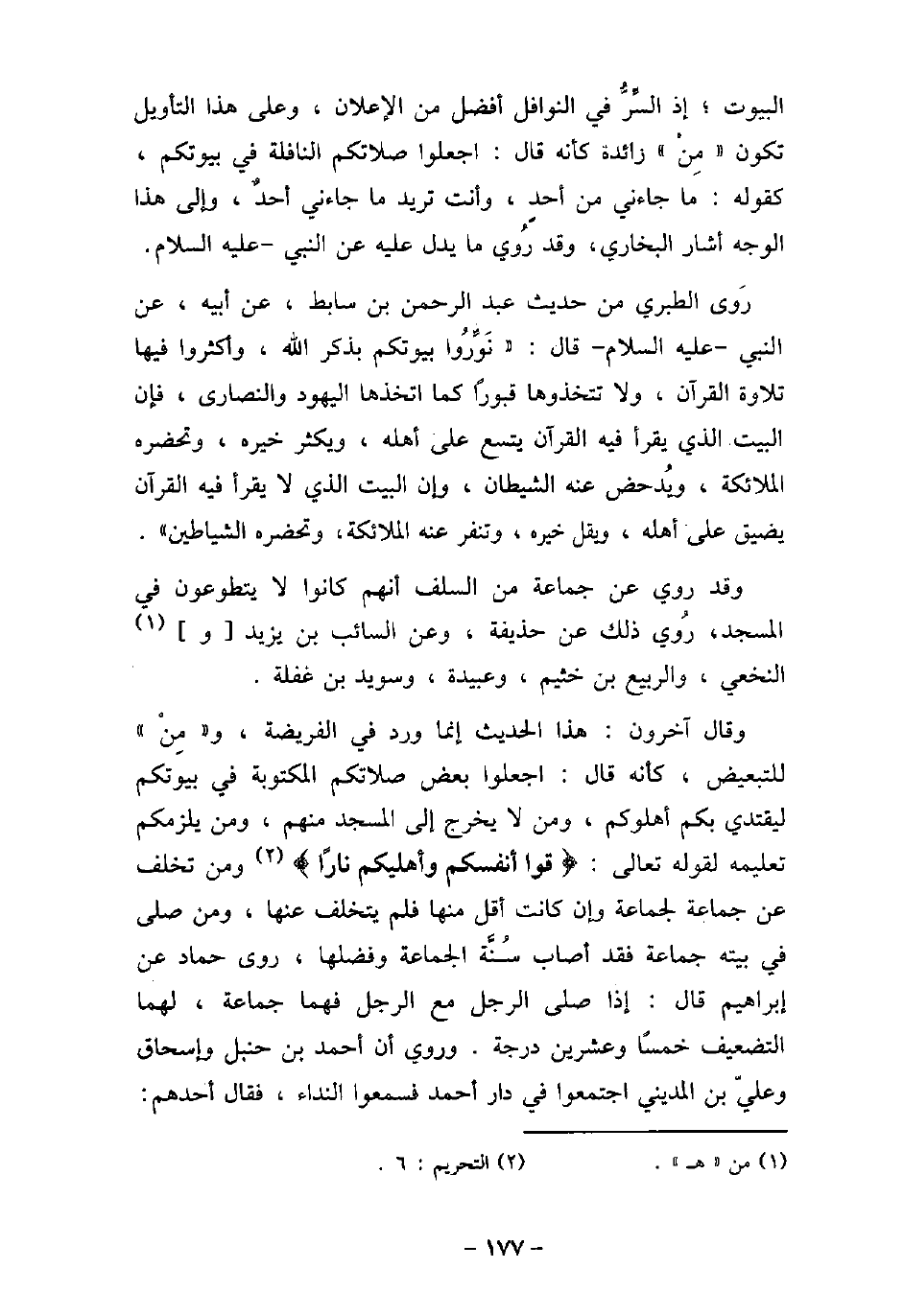 البيوت، إذ السِّرُّ فى النوافل أفضل من الإعلان، وعلى هذا التأويل تكون (مِن) زائدة كأنه قال: اجعلوا صلاتكم النافلة فى بيوتكم، كقوله: ما جاءنى من أحدٍ، وأنت تريد ما جاءنى أحدٌ، وإلى هذا الوجه أشار البخارى، وقد روى ما يدل عليه عن النبى، (صلى الله عليه وسلم) . روى الطبرى من حديث عبد الرحمن بن سابط، عن أبيه، عن النبى، (صلى الله عليه وسلم) ، قال: (نَوِّرُوا بيوتكم بذكر الله، وأكثروا فيها تلاوة القرآن، ولا تتخذوها قبورًا كما اتخذها اليهود والنصارى، فإن البيت الذى يقرأ فيه القرآن يتسع على أهله، ويكثر خيره، وتحضره الملائكة، ويُدحض عنه الشيطان، وإن البيت الذى لا يقرأ فيه القرآن يضيق على أهله، ويقل خيره، وتنفر عنه الملائكة، وتحضره الشياطين) . وقد روى عن جماعة من السلف أنهم كانوا لا يتطوعون فى المسجد، روى ذلك عن حذيفة، وعن السائب بن يزيد، والنخعى، والربيع بن خثيم، وعبيدة، وسويد بن غفلة. وقال آخرون: هذا الحديث إنما ورد فى الفريضة، و (مِنْ) للتبعيض، كأنه قال: اجعلوا بعض صلاتكم المكتوبة فى بيوتكم ليقتدى بكم أهلوكم، ومن لا يخرج إلى المسجد منهم، ومن يلزمكم تعليمه لقوله تعالى: (قوا أنفسكم وأهليكم نارًا) [التحريم: 6] ومن تخلف عن جماعة لجماعة، وإن كانت أقل منها فلم يتخلف عنها، ومن صلى فى بيته جماعة فقد أصاب سُنَّة الجماعة وفضلها. روى حماد، عن إبراهيم قال: إذا صلى الرجل مع الرجل فهما جماعة، لهما التضعيف خمسًا وعشرين درجة. وروى أن أحمد بن حنبل، وإسحاق، وعلى بن المدينى، اجتمعوا فى دار أحمد فسمعوا النداء، فقال أحدهم: