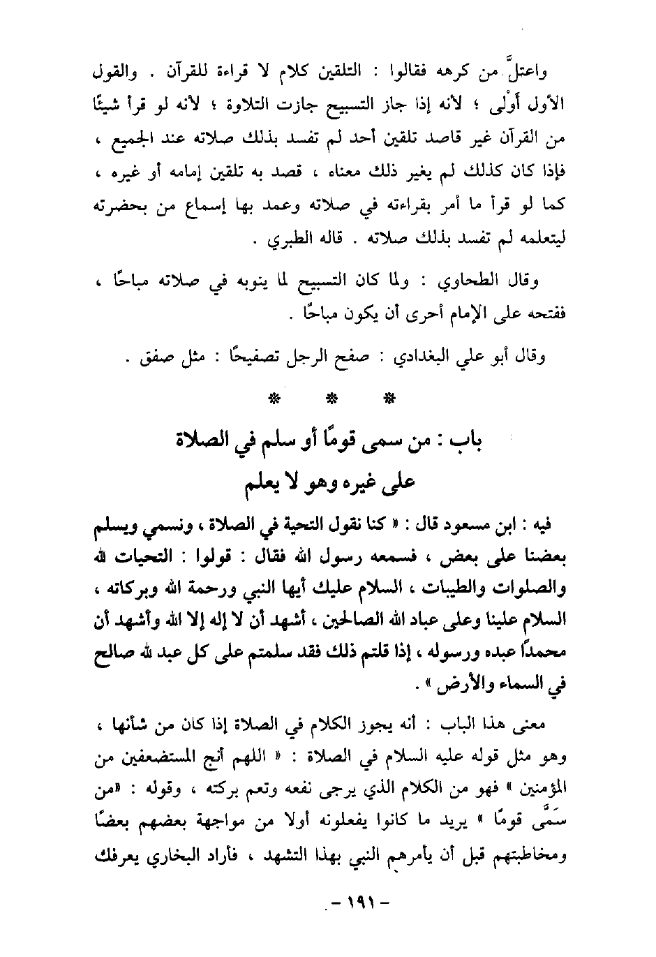 / 156 - فيه: ابْنِ مَسْعُودٍ، قَالَ: كُنَّا نَقُولُ التَّحِيَّةُ فِى الصَّلاةِ، وَنُسَمِّى، وَيُسَلِّمُ بَعْضُنَا عَلَى بَعْضٍ، فَسَمِعَهُ رَسُولُ اللَّهِ (صلى الله عليه وسلم) فَقَالَ: (قُولُوا التَّحِيَّاتُ لِلَّهِ، وَالصَّلَوَاتُ وَالطَّيِّبَاتُ، السَّلامُ عَلَيْكَ أَيُّهَا النَّبِىُّ وَرَحْمَةُ اللَّهِ وَبَرَكَاتُهُ، السَّلامُ عَلَيْنَا وَعَلَى عِبَادِ اللَّهِ الصَّالِحِينَ، أَشْهَدُ أَنْ لا إِلَهَ إِلا اللَّهُ، وَأَشْهَدُ أَنَّ مُحَمَّدًا عَبْدُهُ وَرَسُولُهُ، إِذَا قَلْتُمْ ذَلِكَ، فَقَدْ سَلَّمْتُمْ عَلَى كُلِّ عَبْدٍ لِلَّهِ صَالِحٍ فِى السَّمَاءِ وَالأرْضِ) . معنى هذا الباب: أنه يجوز الكلام فى الصلاة إذا كان من شأنها، وهو مثل قوله، (صلى الله عليه وسلم) ، فى الصلاة: (اللهم أنج المستضعفين من المؤمنين) ، فهو من الكلام الذى يرجى نفعه، وتعم بركته، وقوله: (من سَمَّى قومًا) يريد ما كانوا يفعلونه أولا من مواجهة بعضهم بعضًا ومخاطبتهم قبل أن يأمرهم النبى (صلى الله عليه وسلم) بهذا التشهد، فأراد البخارى يعرفك