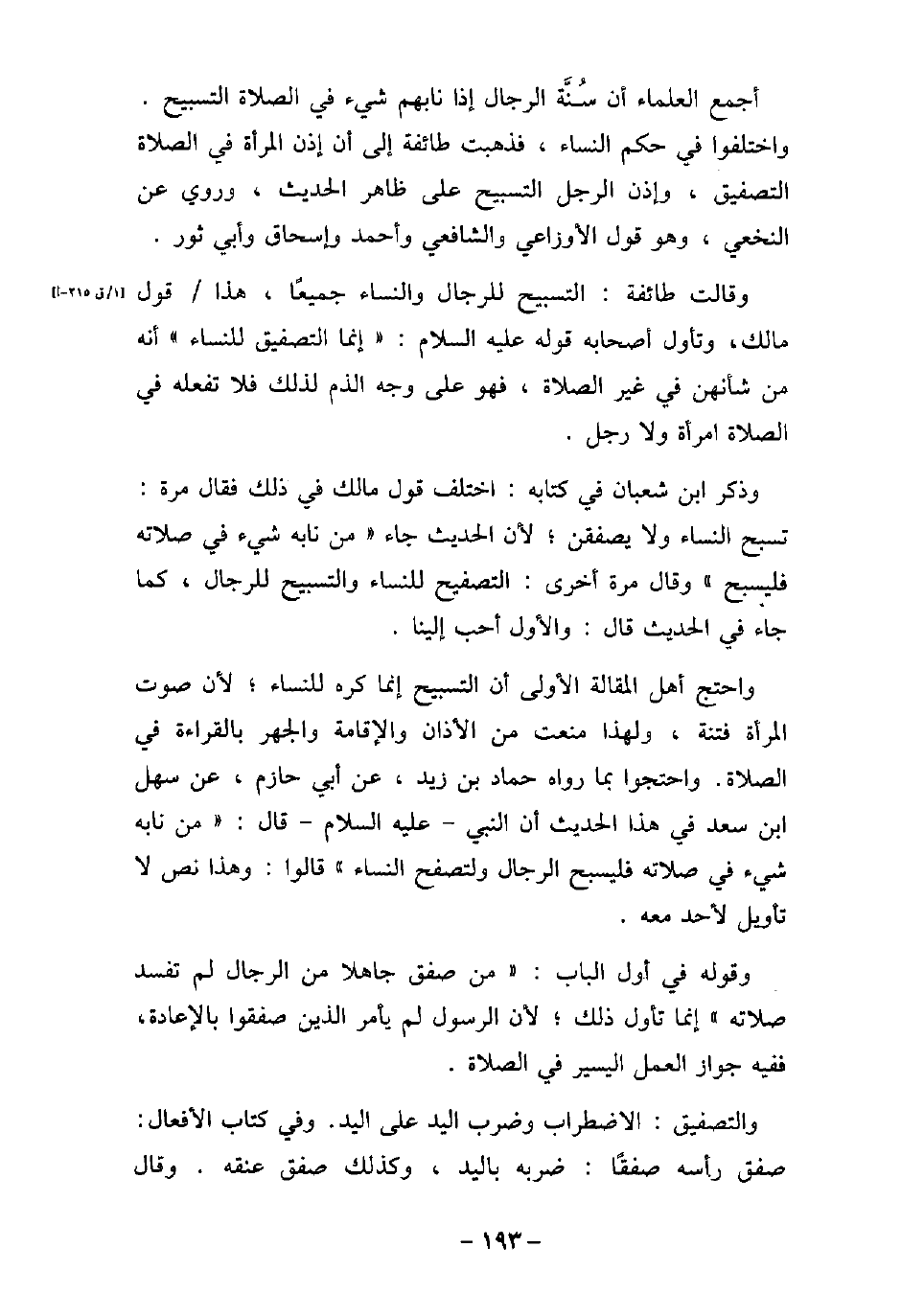 أجمع العلماء أن سُنَّة الرجال إذا نابهم شىء فى الصلاة التسبيح، واختلفوا فى حكم النساء، فذهبت طائفة إلى أن إذن المرأة فى الصلاة التصفيق، وإذن الرجل التسبيح على ظاهر الحديث، وروى عن النخعى، وهو قول الأوزاعى، والشافعى، وأحمد، وإسحاق، وأبى ثور. وقالت طائفة: التسبيح للرجال والنساء جميعًا، هذا قول مالك، وتأول أصحابه قوله (صلى الله عليه وسلم) : (إنما التصفيق للنساء) أنه من شأنهن فى غير الصلاة، فهو على وجه الذم لذلك فلا تفعله فى الصلاة امرأة ولا رجل. وذكر ابن شعبان فى كتابه: اختلف قول مالك فى ذلك، فقال مرة: تسبح النساء ولا يصفقن، لأن الحديث جاء (من نابه شىء فى صلاته فليسبح) ، وقال مرة أخرى: التصفيح للنساء، والتسبيح للرجال، كما جاء فى الحديث، قال: والأول أحب إلينا. واحتج أهل المقالة الأولى أن التسبيح إنما كره للنساء، لأن صوت المرأة فتنة، ولهذا منعت من الأذان، والإقامة، والجهر بالقراءة فى الصلاة، واحتجوا بما رواه حماد بن زيد، عن أبى حازم، عن سهل بن سعد، فى هذا الحديث أن النبى، (صلى الله عليه وسلم) ، قال: (من نابه شىء فى صلاته فليسبح الرجال، ولتصفح النساء) . قالوا: وهذا نص لا تأويل لأحد معه. وقوله فى أول الباب: (من صفق جاهلاً من الرجال لم تفسد صلاته) ، إنما تأول ذلك، لأن الرسول (صلى الله عليه وسلم) لم يأمر الذين صفقوا بالإعادة، ففيه جواز العمل اليسير فى الصلاة. والتصفيق: الاضطراب وضرب اليد على اليد، وفى كتاب الأفعال: صفق رأسه صفقًا: ضربه باليد، وكذلك صفق عنقه. وقال
