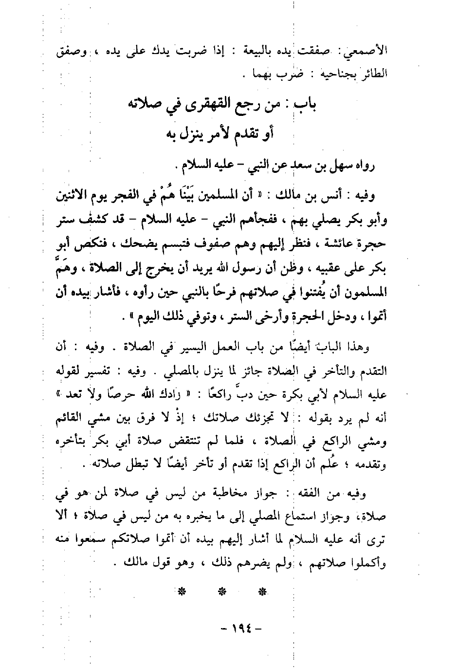 رَوَاهُ سَهْلُ بْنُ سَعْدٍ، عَنِ النَّبِىِّ، (صلى الله عليه وسلم) . / 158 - وفيه: أَنَسُ بْنُ مَالِكٍ، أَنَّ الْمُسْلِمِينَ بَيْنَا هُمْ فِى الْفَجْرِ يَوْمَ الاثْنَيْنِ، وَأَبُو بَكْرٍ يُصَلِّى بِهِمْ، فَفَجِئَهُمُ النَّبِىُّ، (صلى الله عليه وسلم) ، قَدْ كَشَفَ سِتْرَ حُجْرَةِ عَائِشَةَ، فَنَظَرَ إِلَيْهِمْ وَهُمْ صُفُوفٌ، فَتَبَسَّمَ يَضْحَكُ، فَنَكَصَ أَبُو بَكْرٍ عَلَى عَقِبَيْهِ، وَظَنَّ أَنَّ رَسُولَ اللَّهِ (صلى الله عليه وسلم) يُرِيدُ أَنْ يَخْرُجَ إِلَى الصَّلاةِ، وَهَمَّ الْمُسْلِمُونَ أَنْ يَفْتَتِنُوا فِى صَلاتِهِمْ فَرَحًا بِالنَّبِىِّ (صلى الله عليه وسلم) حِينَ رَأَوْهُ، فَأَشَارَ بِيَدِهِ: أَنْ أَتِمُّوا، ثُمَّ دَخَلَ الْحُجْرَةَ، وَأَرْخَى السِّتْرَ، وَتُوُفِّىَ ذَلِكَ الْيَوْمَ. وهذا الباب أيضًا من باب العمل اليسير فى الصلاة. وفيه: أن التقدم والتأخر فى الصلاة جائز لما ينزل بالمصلى. وفيه: تفسير لقوله (صلى الله عليه وسلم) لأبى بكرة حين دبَّ راكعًا: (زادك الله حرصًا ولا تعد) أنه لم يرد بقوله: لا تجزئك صلاتك إذ لا فرق بين مشى القائم ومشى الراكع فى الصلاة، فلما لم تنتقض صلاة أبى بكر بتأخره وتقدمه، عُلم أن الراكع إذا تقدم أو تأخر أيضًا لا تبطل صلاته. وفيه من الفقه: جواز مخاطبة من ليس فى صلاة لمن هو فى صلاة، وجواز استماع المصلى إلى ما يخبره به من ليس فى صلاة ألا ترى أنه (صلى الله عليه وسلم) لما أشار إليهم بيده أن أتموا صلاتكم سمعوا منه وأكملوا صلاتهم، ولم يضرهم ذلك، وهو قول مالك.