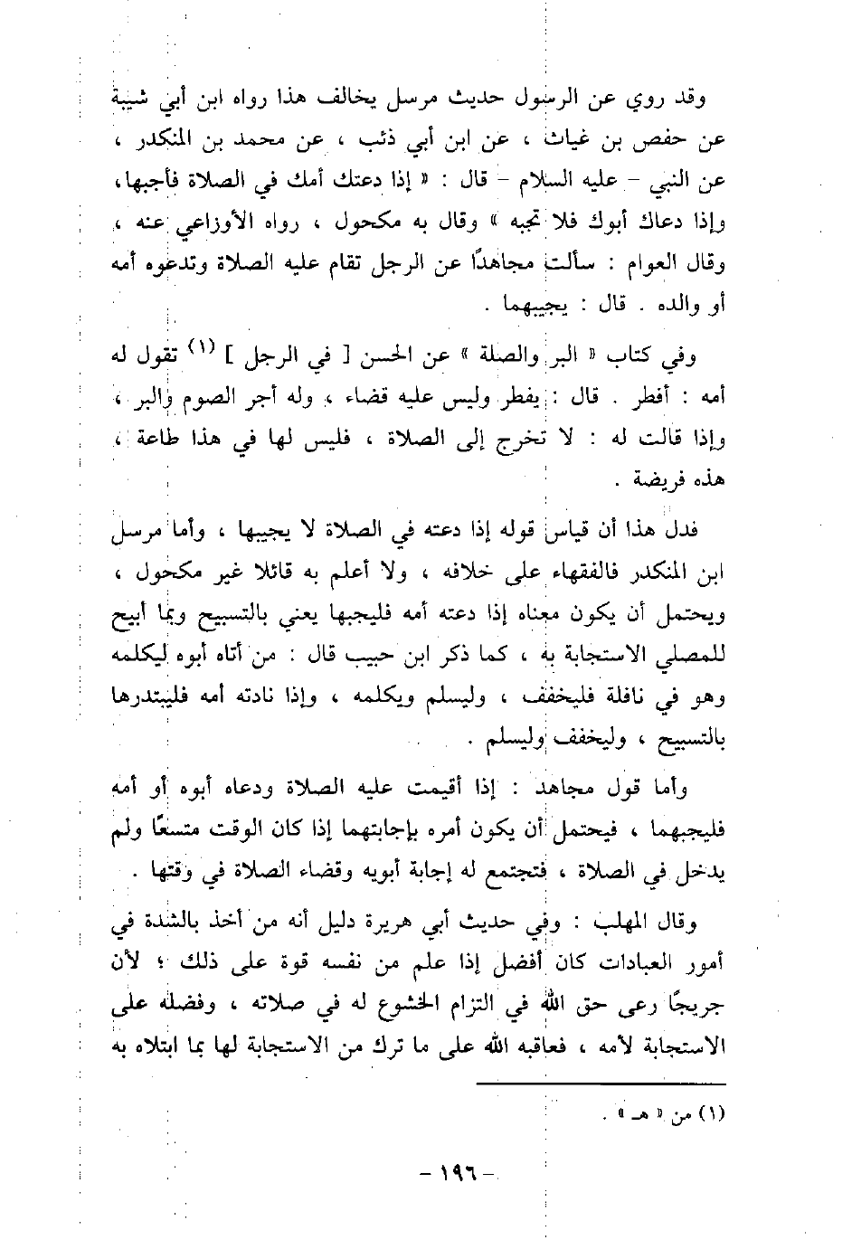 وقد روى عن الرسول (صلى الله عليه وسلم) حديث مرسل يخالف هذا رواه ابن أبى شيبة عن حفص ابن غياث، عن ابن أبى ذئب، عن محمد بن المنكدر، عن النبى، (صلى الله عليه وسلم) ، قال: (إذا دعتك أمك فأجبها، وإذا دعاك أبوك فلا تجبه) ، وقال به مكحول، رواه الأوزاعى عنه، وقال العوام: سألت مجاهدًا عن الرجل تقام عليه الصلاة وتدعوه أمه أو والده، قال: يجيبهما. وفى كتاب البر والصلة، عن الحسن فى الرجل تقول له أمه: أفطر، قال: يفطر وليس عليه قضاء، وله أجر الصوم والبر، وإذا قالت له: لا تخرج إلى الصلاة، فليس لها فى هذا طاعة، هذه فريضة. فدل هذا أن قياس قوله إذا دعته فى الصلاة لا يجيبها، وأما مرسل ابن المنكدر فالفقهاء على خلافه، ولا أعلم به قائلاً غير مكحول، ويحتمل أن يكون معناه إذا دعته أمه فليجبها، يعنى بالتسبيح وبما أبيح للمصلى الاستجابة به، كما ذكر ابن حبيب، قال: من أتاه أبوه ليكلمه وهو فى نافلة فليخفف، وليسلم ويكلمه، وإذا نادته أمه فليبتدرها بالتسبيح، وليخفف وليسلم. وأما قول مجاهد: إذا أقميت عليه الصلاة ودعاه أبوه، أو أمه فليجبهما، فيحتمل أن يكون أمره بإجابتهما إذا كان الوقت متسعًا، ولم يدخل فى الصلاة، فتجتمع له إجابة أبويه وقضاء الصلاة فى وقتها. وقال المهلب: وفى حديث أبى هريرة دليل أنه من أخذ بالشدة فى أمور العبادات كان أفضل إذا علم من نفسه قوة على ذلك، لأن جريجًا رعى حق الله فى التزام الخشوع له فى صلاته، وفضله على الاستجابة لأمه، فعاقبه الله على ما ترك من الاستجابة لها بما ابتلاه به