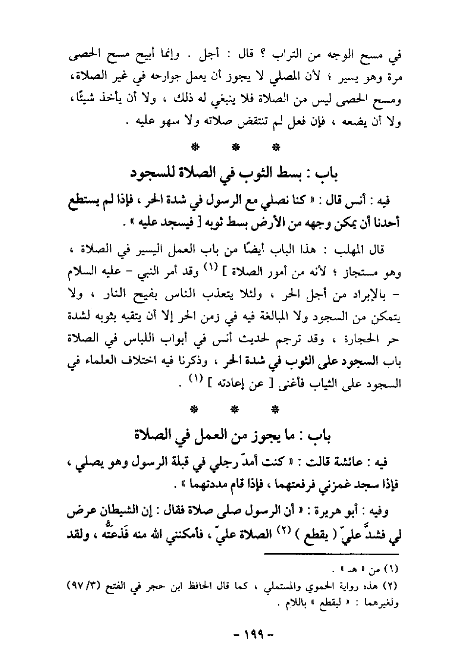 / 162 - فيه: عَائِشَةَ، قَالَتْ: كُنْتُ أَمُدُّ رِجْلِى فِى قِبْلَةِ الرسُول (صلى الله عليه وسلم) وَهُوَ يُصَلِّى فَإِذَا سَجَدَ غَمَزَنِى، فَرَفَعْتُهَا فَإِذَا قَامَ مَدَدْتُهَما. / 163 - وفيه: أَبُو هُرَيْرَةَ، أن الرسُول (صلى الله عليه وسلم) صَلَّى صَلاةً، فَقَالَ: (إِنَّ الشَّيْطَانَ عَرَضَ لِي، فَشَدَّ عَلَىَّ، لِيَقْطَعَ الصَّلاةَ عَلَىَّ فَأَمْكَنَنِى اللَّهُ مِنْهُ، فَذَعَتُّهُ، وَلَقَدْ