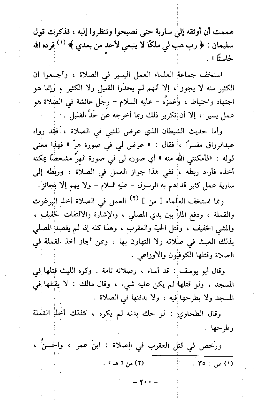 هَمَمْتُ أَنْ أُوثِقَهُ إِلَى سَارِيَةٍ حَتَّى تُصْبِحُوا، فَتَنْظُرُوا إِلَيْهِ، فَذَكَرْتُ قَوْلَ سُلَيْمَانَ: (رَبّ هَبْ لِى مُلْكًا لا يَنْبَغِى لأحَدٍ مِنْ بَعْدِى) [ص: 35] فَرَدَّهُ اللَّهُ خَاسِئًا) . استخف جماعة العلماء العمل اليسير فى الصلاة، وأجمعوا أن الكثير منه لا يجوز، إلا أنهم لم يحدّوا القليل، ولا الكثير، وإنما هو اجتهاد واحتياط، وغمزُه، (صلى الله عليه وسلم) ، رجل عائشة فى الصلاة هو عمل يسير، إلا أن تكرير ذلك ربما أخرجه عن حَدِّ القليل. وأما حديث الشيطان الذى عرض للنبى (صلى الله عليه وسلم) فى الصلاة، فقد رواه عبد الرزاق مفسرًا، فقال: (عرض لى فى صورة هرّ) ، فهذا معنى قوله: (فأمكننى الله منه) أى صوره لى فى صورة الهرِّ مشخصًا يمكنه أخذه، فأراد ربطه، ففى هذا جواز العمل فى الصلاة، وربطه إلى سارية عمل كثير قد هم به الرسول، (صلى الله عليه وسلم) ، ولا يهم إلا بجائز. ومما استخف العلماء من العمل فى الصلاة أخذ البرغوث والقملة، ودفع المارِّ بين يدى المصلى، والإشارة والالتفات الخفيف، والمشى الخفيف، وقتل الحية والعقرب، وهذا كله إذا لم يقصد المصلى بذلك العبث فى صلاته ولا التهاون بها، وممن أجاز أخذ القملة فى الصلاة وقتلها الكوفيون والأوزاعى. وقال أبو يوسف: قد أساء، وصلاته تامة، وكره الليث قتلها فى المسجد، ولو قتلها لم يكن عليه شىء، وقال مالك: لا يقتلها فى المسجد ولا يطرحها فيه، ولا يدفنها فى الصلاة. وقال الطحاوى: لو حك بدنه لم يكره، كذلك أخذ القملة وطرحها. ورخص فى قتل العقرب فى الصلاة: ابن عمر، والحسن،