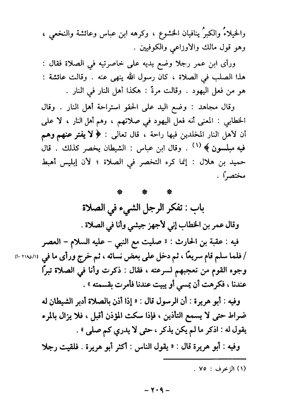 وَقَالَ عُمَرُ بنْ الخَطَّاب: إِنِّى لأجَهِّزُ جَيْشِى، وَأَنَا فِى الصَّلاةِ. / 173 - فيه: عُقْبَةَ بْنِ الْحَارِثِ، صَلَّيْتُ مَعَ النَّبِىِّ (صلى الله عليه وسلم) الْعَصْرَ فَلَمَّا سَلَّمَ، قَامَ سَرِيعًا، ثًمَّ دَخَلَ عَلَى بَعْضِ نِسَائِهِ، ثُمَّ خَرَجَ، وَرَأَى مَا فِى وُجُوهِ الْقَوْمِ مِنْ تَعَجُّبِهِمْ لِسُرْعَتِهِ، فَقَالَ: (ذَكَرْتُ وَأَنَا فِى الصَّلاةِ تِبْرًا عِنْدَنَا، فَكَرِهْتُ أَنْ يُمْسِىَ، أَوْ يَبِيتَ، عِنْدَنَا، فَأَمَرْتُ بِقِسْمَتِهِ) . / 174 - وفيه: أَبُو هُرَيْرَةَ، أن الرَسُول (صلى الله عليه وسلم) ، قَالَ: (إِذَا أُذِّنَ بِالصَّلاةِ أَدْبَرَ الشَّيْطَانُ، لَهُ ضُرَاطٌ حَتَّى لا يَسْمَعَ التَّأْذِينَ، فَإِذَا سَكَتَ الْمُؤَذِّنُ أَقْبَلَ، فَلا يَزَالُ بِالْمَرْءِ يَقُولُ لَهُ: اذْكُرْ مَا لَمْ يَكُنْ يَذْكُرُ، حَتَّى لا يَدْرِىَ كَمْ صَلَّى (. / 175 - وفيه: أَبُو هُرَيْرَةَ قَالَ: يَقُولُ النَّاسُ: أَكْثَرَ أَبُو هُرَيْرَةَ، فَلَقِيتُ رَجُلا،