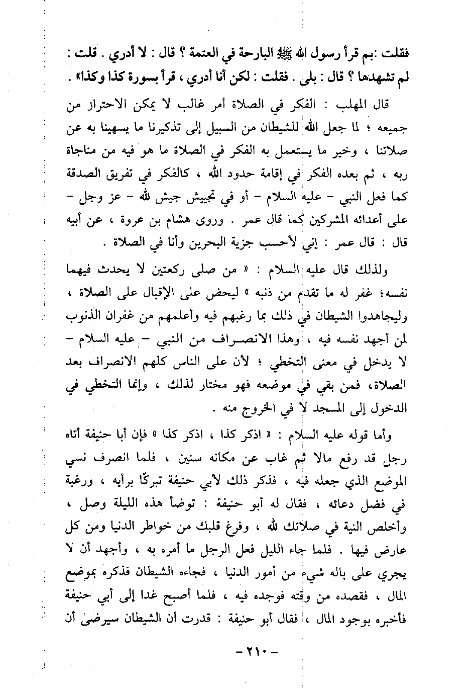 فَقُلْتُ: بِمَا قَرَأَ رَسُولُ اللَّهِ (صلى الله عليه وسلم) الْبَارِحَةَ فِى الْعَتَمَةِ؟ فَقَالَ: لا أَدْرِى، قُلْتُ: لَمْ تَشْهَدْهَا، قَالَ: بَلَى، قَقُلْتُ: لَكِنْ أَنَا أَدْرِى، قَرَأَ بسُورَةَ كَذَا وَكَذَا. قال المهلب: الفكر فى الصلاة أمر غالب لا يمكن الاحتراز من جميعه، لما جعل الله للشيطان من السبيل إلى تذكيرنا ما يسهينا به عن صلاتنا، وخير ما يستعمل به الفكر فى الصلاة ما هو فيه من مناجاة ربه، ثم بعده الفكر فى إقامة حدود الله، كالفكر فى تفريق الصدقة كما فعل النبى، (صلى الله عليه وسلم) ، أو فى تجييش جيش الله، عز وجل، على أعدائه المشركين كما قال عمر. وروى هشام بن عروة، عن أبيه، قال: قال عمر: إنى لأحسب جزية البحرين، وأنا فى الصلاة. ولذلك قال (صلى الله عليه وسلم) : (من صلى ركعتين لا يحدث فيهما نفسه، غفر له ما تقدم من ذنبه) ، ليحض على الإقبال على الصلاة، وليجاهدوا الشيطان فى ذلك بما رغبهم فيه، وأعلمهم من غفران الذنوب لمن أجهد نفسه فيه، وهذا الانصراف من النبى، (صلى الله عليه وسلم) ، لا يدخل فى معنى التخطى، لأن على الناس كلهم الانصراف بعد الصلاة، فمن بقى فى موضعه فهو مختار لذلك، وإنما التخطى فى الدخول إلى المسجد لا فى الخروج منه. وأما قوله (صلى الله عليه وسلم) : (اذكر كذا، اذكر كذا) ، فإن أبا حنيفة أتاه رجل قد رفع مالا، ثم غاب عن مكانه سنين، فلما انصرف نسى الموضع الذى جعله فيه، فذكر ذلك لأبى حنيفة تبركًا برأيه، ورغبة فى فضل دعائه، فقال أبو حنيفة: توضأ هذه الليلة وصل، وأخلص النية فى صلاتك لله، وفرغ قلبك من خواطر الدنيا ومن كل عارض فيها، فلما جاء الليل فعل الرجل ما أمره به، وأجهد أن لا يجرى على باله شىء من أمور الدنيا، فجاءه الشيطان فذكره بموضع المال، فقصده من وقته فوجده فيه، فلما أصبح غدا إلى أبى حنيفة، فأخبره بوجود المال، فقال أبو حنيفة: قدرت أن الشيطان سيرضى أن