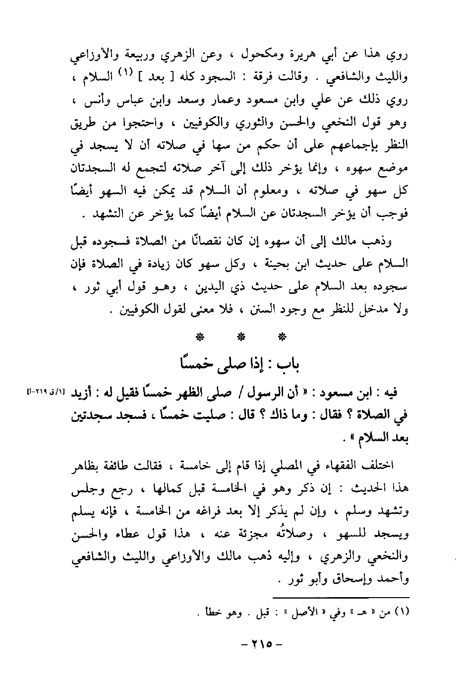 / 177 - فيه: ابن مسعود، أَنَّ الرَسُول (صلى الله عليه وسلم) صَلَّى الظُّهْرَ خَمْسًا، فَقِيلَ لَهُ: أَزِيدَ فِى الصَّلاةِ؟ فَقَالَ (وَمَا ذَاكَ) ، قَالَ: صَلَّيْتَ خَمْسًا، فَسَجَدَ سَجْدَتَيْنِ، بَعْدَ مَا سَلَّمَ. اختلف الفقهاء فى المصلى إذا قام إلى خامسة، فقالت طائفة بظاهر هذا الحديث: إن ذكر وهو فى الخامسة قبل كمالها، رجع وجلس وتشهد وسلم، وإن لم يذكر إلا بعد فراغه من الخامسة، فإنه يسلم، ويسجد للسهو، وصلاته مجزئة عنه، هذا قول عطاء، والحسن، والنخعى، والزهرى، وإليه ذهب مالك، والأوزاعى، والليث، والشافعى، وأحمد، وإسحاق، وأبو ثور.