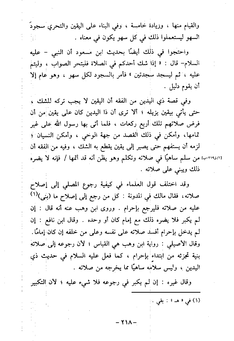 والقيام منها، وزيادة خامسة، وفى البناء على اليقين، والتحرى سجود السهو، ليستعملوا ذلك فى كل سهو يكون فى معناه. واحتجوا فى ذلك أيضًا بحديث ابن مسعود أن النبى، (صلى الله عليه وسلم) ، قال: (إذا شك أحدكم فى الصلاة، فليتحر الصواب، وليتم عليه، ثم ليسجد سجدتين) ، فأمر بالسجود لكل سهو، وهو عام إلا أن يقوم دليل. وفى قصة ذى اليدين من الفقه أن اليقين لا يجب تركه للشك، حتى يأتى بيقين يزيله، ألا ترى أن ذا اليدين كان على يقين من أن فرض صلاتهم تلك أربع ركعات، فلما أتى بها رسول الله (صلى الله عليه وسلم) على غير تمامها، وأمكن فى ذلك القصد من جهة الوحى، وأمكن النسيان، لزمه أن يستفهم حتى يصير إلى يقين يقطع به الشك، وفيه من الفقه أن من سلم ساهيًا فى صلاته وتكلم، وهو يظن أنه قد أتمها، فإنه لا يضره ذلك ويبنى على صلاته. وقد اختلف قول العلماء فى كيفية رجوع المصلى إلى إصلاح صلاته، فقال مالك فى المدونة: كل من رجع إلى إصلاح ما بنى عليه من صلاته، فليرجع بإحرام. وروى ابن وهب عنه أنه قال: إن لم يكبر فلا يضره ذلك مع إمام كان أو وحده. وقال ابن نافع: إن لم يدخل بإحرام أفسد صلاته على نفسه، وعلى من خلفه إن كان إمامًا. وقال الأصيلى: رواية ابن وهب هى القياس، لأن رجوعه إلى صلاته بنية تجزئه من ابتداء بإحرام، كما فعل (صلى الله عليه وسلم) فى حديث ذى اليدين، وليس سلامه ساهيًا مما يخرجه من صلاته. وقال غيره: إن لم يكبر فى رجوعه فلا شىء عليه، لأن التكبير