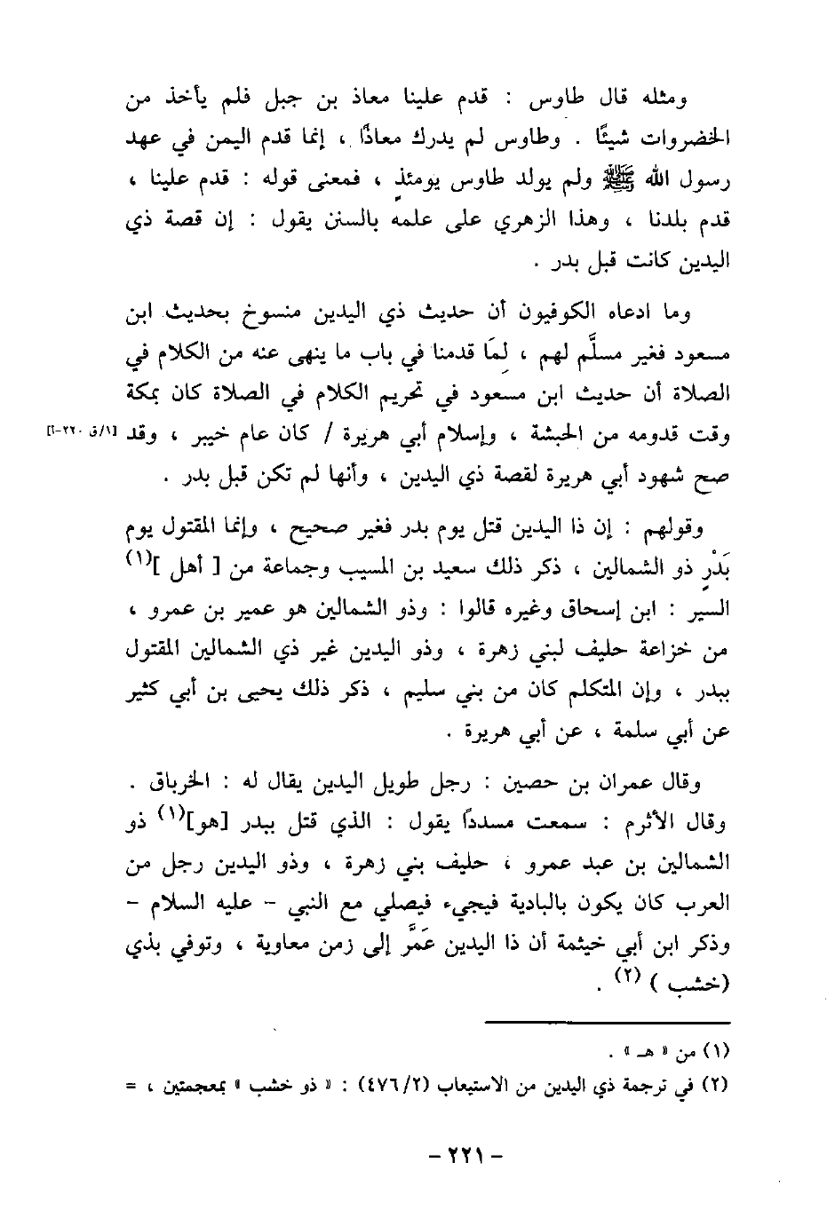 ومثله قال طاوس: قدم علينا معاذ بن جبل، فلم يأخذ من الخضروات شيئًا، وطاوس لم يدرك معاذًا، إنما قدم اليمن فى عهد رسول الله (صلى الله عليه وسلم) ، ولم يولد طاوس يومئذ، فمعنى قوله: قدم علينا، قدم بلدنا، وهذا الزهرى على علمه بالسنن يقول: إن قصة ذى اليدين كانت قبل بدر. وما ادعاه الكوفيون أن حديث ذى اليدين منسوخ بحديث ابن مسعود فغير مسلَّم لهم، لما قدمنا فى باب ما ينهى عنه من الكلام فى الصلاة أن حديث ابن مسعود فى تحريم الكلام فى الصلاة كان بمكة، وقت قدومه من الحبشة، وإسلام أبى هريرة كان عام خيبر، وقد صح شهود أبى هريرة لقصة ذى اليدين، وأنها لم تكن قبل بدر. وقولهم: إن ذا اليدين قتل يوم بدر، فغير صحيح، وإنما المقتول يوم بدر ذو الشمالين، ذكر ذلك سعيد بن المسيب، وجماعة من أهل السير: ابن إسحاق وغيره، قالوا: وذو الشمالين هو عمير بن عمرو، من خزاعة حليف لبنى زهرة، وذو اليدين غير ذى الشمالين المقتول ببدر، وإن المتكلم كان من بنى سليم، ذكر ذلك يحيى بن أبى كثير، عن أبى سلمة، عن أبى هريرة. وقال عمران بن حصين: رجل طويل اليدين يقال له: الخرباق، وقال الأثرم: سمعت مسددًا يقول: الذى قتل ببدر هو ذو الشمالين بن عبد عمرو، حليف بنى زهرة، وذو اليدين رجل من العرب كان يكون بالبادية، فيجئ فيصلى مع النبى، (صلى الله عليه وسلم) ، وذكر ابن أبى خيثمة أن ذا اليدين عَمَّر إلى زمن معاوية، وتوفى بذى خشب.