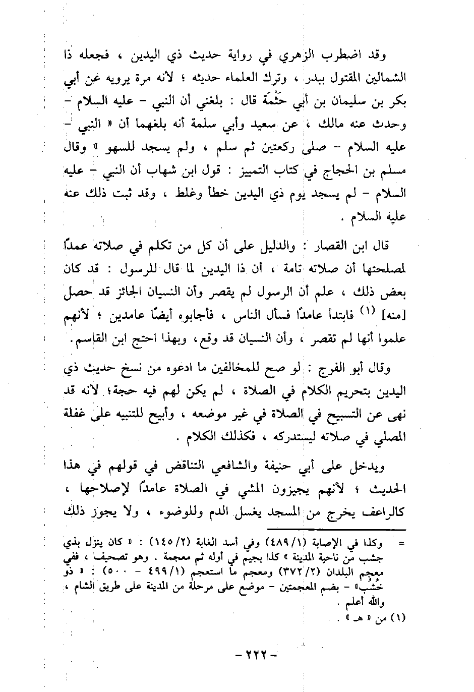 وقد اضطرب الزهرى فى رواية حديث ذى اليدين، فجعله ذا الشمالين المقتول ببدر، وترك العلماء حديثه، لأنه مرة يرويه عن أبى بكر بن سليمان بن أبى حَثْمَة، قال: بلغنى أن النبى، (صلى الله عليه وسلم) ، وحدث عنه مالك، عن سعيد وأبى سلمة، أنه بلغهما: أن النبى، (صلى الله عليه وسلم) ، صلى ركعتين ثم سلم، ولم يسجد للسهو. وقال مسلم بن الحجاج فى كتاب التمييز: قول ابن شهاب أن النبى، (صلى الله عليه وسلم) ، لم يسجد يوم ذى اليدين خطأ وغلط، وقد ثبت ذلك عنه (صلى الله عليه وسلم) . قال ابن القصار: والدليل على أن كل من تكلم فى صلاته عمدًا لمصلحتها أن صلاته تامة، أن ذا اليدين لما قال للرسول (صلى الله عليه وسلم) : قد كان بعض ذلك، علم أن الرسول (صلى الله عليه وسلم) لم يقصر، وأن النسيان الجائز قد حصل منه فابتدأ عامدًا فسأل الناس، فأجابوه أيضًا عامدين، لأنهم علموا أنها لم تقصر، وأن النسيان قد وقع، وبهذا احتج ابن القاسم. وقال أبو الفرج: لو صح للمخالفين ما ادعوه من نسخ حديث ذى اليدين بتحريم الكلام فى الصلاة، لم يكن لهم فيه حجة، لأنه قد نهى عن التسبيح فى الصلاة فى غير موضعه، وأبيح للتنبيه على غفلة المصلى فى صلاته ليستدركه، فكذلك الكلام. ويدخل على أبى حنيفة والشافعى التناقض فى قولهم فى هذا الحديث، لأنهم يجيزون المشى فى الصلاة عامدًا لإصلاحها، كالراعف يخرج من المسجد يغسل الدم وللوضوء، ولا يجوز ذلك،