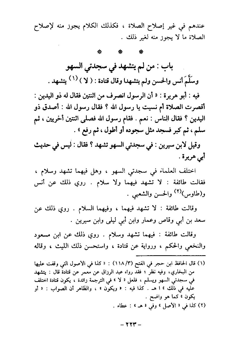 وَسَلَّمَ أَنَسٌ وَالْحَسَنُ وَلَمْ يَتَشَهَّدَا. وَقَالَ قَتَادَةُ: لا يَتَشَهَّدُ. / 179 - فيه: أَبُو هُرَيْرَةَ، أَنَّ الرسُول (صلى الله عليه وسلم) انْصَرَفَ مِنِ اثْنَتَيْنِ، فَقَالَ لَهُ ذُو الْيَدَيْنِ: أَقَصُرَتِ الصَّلاةُ أَمْ نَسِيتَ يَا رَسُولَ اللَّهِ؟ فَقَالَ رَسُولُ اللَّهِ (صلى الله عليه وسلم) : (أَصَدَقَ ذُو الْيَدَيْنِ) ؟ فَقَالَ النَّاسُ: نَعَمْ، فَقَامَ رَسُولُ اللَّهِ (صلى الله عليه وسلم) فَصَلَّى اثْنَتَيْنِ أُخْرَيَيْنِ، ثُمَّ سَلَّمَ، ثُمَّ كَبَّرَ فَسَجَدَ مِثْلَ سُجُودِهِ، أَوْ أَطْوَلَ، ثُمَّ رَفَعَ. وقيل لابن سيرين: فِى سَجْدَتَىِ السَّهْوِ تَشَهُّدٌ؟ قَالَ: لَيْسَ فِى حَدِيثِ أَبِى هُرَيْرَةَ. اختلف العلماء فى سجدتى السهو، وهل فيهما تشهد وسلام، فقالت طائفة: لا تشهد فيها، ولا سلام. روى ذلك عن أنس، وطاوس، والحسن، والشعبى. وقالت طائفة: لا تشهد فيهما، وفيهما سلام. روى ذلك عن سعد بن أبى وقاص، وعمار، وابن أبى ليلى، وابن سيرين. وقالت طائفة: فيهما تشهد وسلام. روى ذلك عن ابن مسعود، والنخعى، والحكم، ورواية عن قتادة، واستحسن ذلك الليث، وقاله