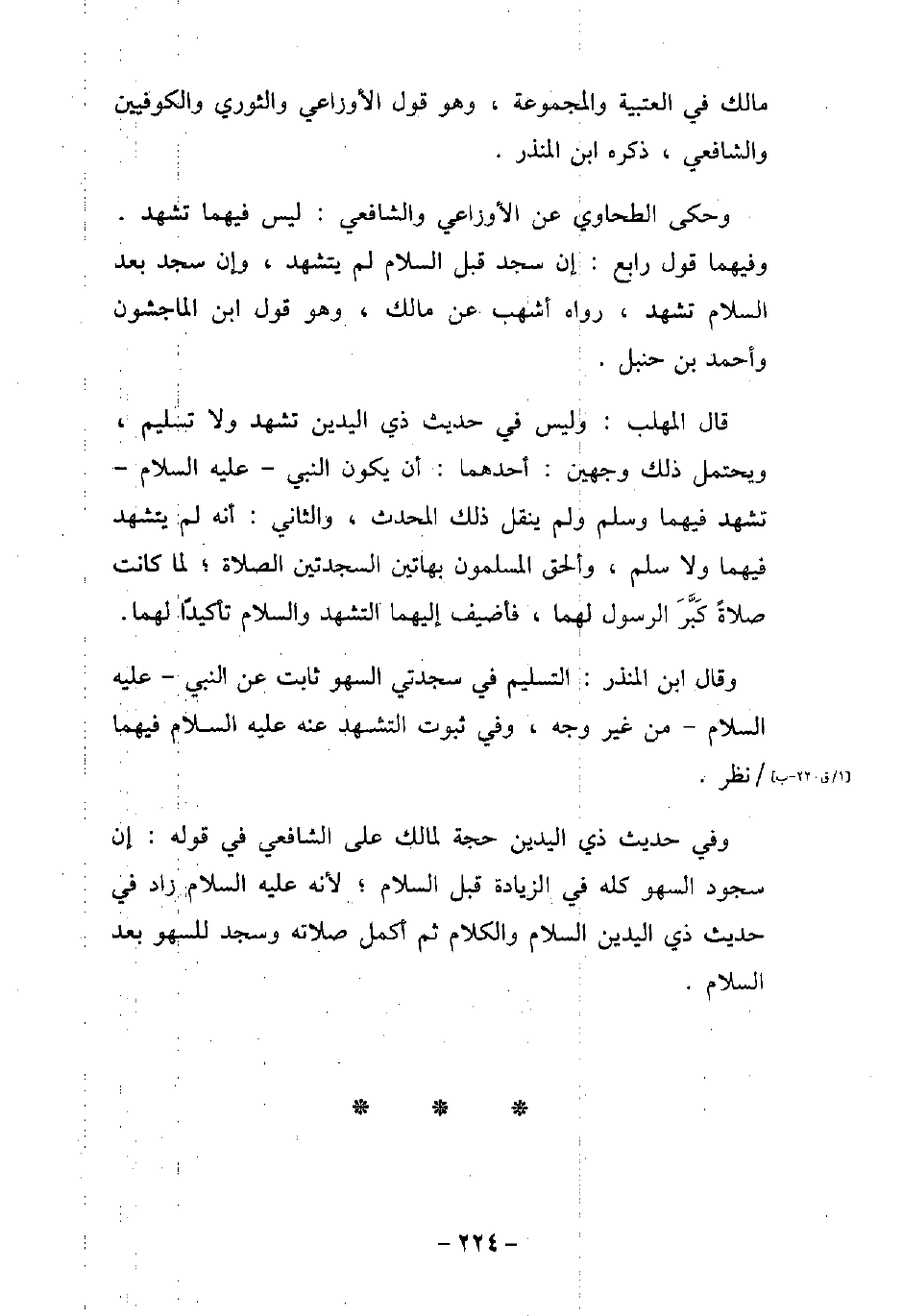 مالك فى العتبية والمجموعة، وهو قول الأوزاعى، والثورى، والكوفيين، والشافعى، ذكره ابن المنذر. وحكى الطحاوى، عن الأوزاعى، والشافعى: ليس فيهما تشهد. وفيهما قول رابع: إن سجد قبل السلام لم يتشهد، وإن سجد بعد السلام تشهد، رواه أشهب، عن مالك، وهو قول ابن الماجشون، وأحمد بن حنبل. قال المهلب: وليس فى حديث ذى اليدين تشهد، ولا تسليم، ويحتمل ذلك وجهين: أحدهما: أن يكون النبى، (صلى الله عليه وسلم) ، تشهد فيهما وسلم، ولم ينقل ذلك المحدث. والثانى: أنه لم يتشهد فيهما، ولا سلم، وألحق المسلمون بهاتين السجدتين الصلاة، لما كانت صلاةً كَبَّرَ الرسول لهما، فأضيف إليهما التشهد، والسلام تأكيدًا لهما. وقال ابن المنذر: التسليم فى سجدتى السهو ثابت عن النبى، (صلى الله عليه وسلم) ، من غير وجه، وفى ثبوت التشهد عنه (صلى الله عليه وسلم) فيهما نظر. وفى حديث ذى اليدين حجة لمالك على الشافعى فى قوله: إن سجود السهو كله فى الزيادة قبل السلام، لأنه (صلى الله عليه وسلم) زاد فى حديث ذى اليدين السلام، والكلام، ثم أكمل صلاته وسجد للسهو بعد السلام.