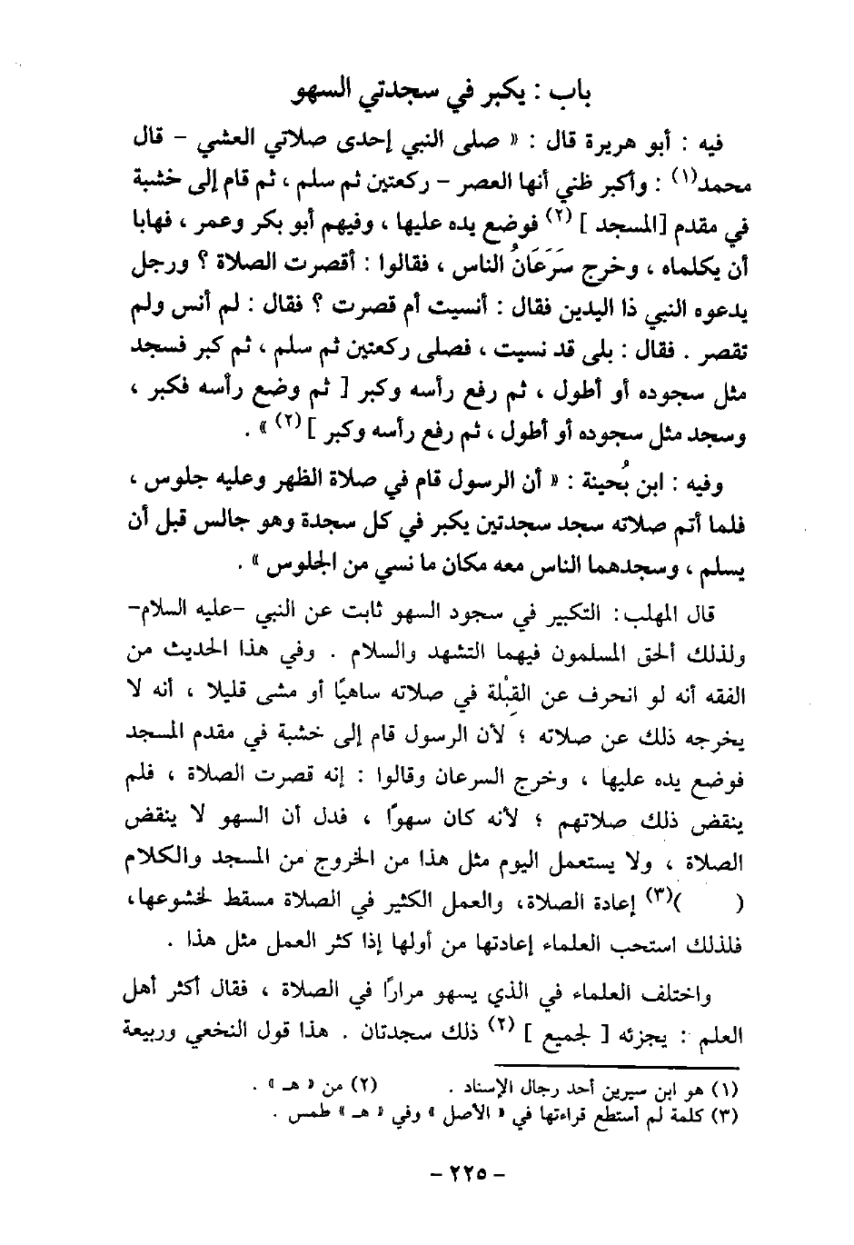 / 180 - فيه: أَبُو هُرَيْرَةَ، قَالَ: صَلَّى النَّبِىُّ (صلى الله عليه وسلم) إِحْدَى صَلاتَىِ الْعَشِىِّ - قَالَ مُحَمَّدٌ: وَأَكْثَرُ ظَنِّى الْعَصْرَ - رَكْعَتَيْنِ، ثُمَّ سَلَّمَ، ثُمَّ قَامَ إِلَى خَشَبَةٍ فِى مُقَدَّمِ الْمَسْجِدِ، فَوَضَعَ يَدَهُ عَلَيْهَا، وَفِيهِمْ أَبُو بَكْرٍ وَعُمَرُ، فَهَابَا أَنْ يُكَلِّمَاهُ، وَخَرَجَ سَرَعَانُ النَّاسِ، فَقَالُوا: أَقَصُرَتِ الصَّلاةُ؟ وَرَجُلٌ يَدْعُوهُ النَّبِىُّ (صلى الله عليه وسلم) ذُو الْيَدَيْنِ، فَقَالَ: أَنَسِيتَ أَمْ قَصُرَتْ؟ فَقَالَ: (لَمْ أَنْسَ وَلَمْ تُقْصَرْ) ، قَالَ: بَلَى، قَدْ نَسِيتَ، فَصَلَّى رَكْعَتَيْنِ، ثُمَّ سَلَّمَ، ثُمَّ كَبَّرَ، فَسَجَدَ مِثْلَ سُجُودِهِ أَوْ أَطْوَلَ، ثُمَّ رَفَعَ رَأْسَهُ وَكَبَّرَ، ثُمَّ وَضَعَ رَأْسَهُ فَكَبَّرَ، وَسَجَدَ مِثْلَ سُجُودِهِ أَوْ أَطْوَلَ، ثُمَّ رَفَعَ رَأْسَهُ وَكَبَّرَ. / 181 - وفيه: ابن بُحَيْنَةَ، أَنَّ الرسُول (صلى الله عليه وسلم) قَامَ فِى صَلاةِ الظُّهْرِ، وَعَلَيْهِ جُلُوسٌ، فَلَمَّا أَتَمَّ صَلاتَهُ سَجَدَ سَجْدَتَيْنِ، فَكَبَّرَ فِى كُلِّ سَجْدَةٍ، وَهُوَ جَالِسٌ، قَبْلَ أَنْ يُسَلِّمَ، وَسَجَدَهُمَا النَّاسُ مَعَهُ مَكَانَ مَا نَسِىَ مِنَ الْجُلُوسِ. قال المهلب: التكبير فى سجود السهو ثابت عن النبى، (صلى الله عليه وسلم) ، ولذلك ألحق المسلمون فيهما التشهد والسلام. وفى هذا الحديث من الفقه أنه لو انحرف عن القبلة فى صلاته ساهيًا أو مشى قليلاً، أنه لا يخرجه ذلك عن صلاته، لأن الرسول (صلى الله عليه وسلم) قام إلى خشبة فى مقدم المسجد فوضع يده عليها، وخرج السرعان، وقالوا: إنه قصرت الصلاة، فلم ينقض ذلك صلاتهم، لأنه كان سهوًا، فدل أن السهو لا ينقض الصلاة، ولا يستعمل اليوم مثل هذا من الخروج من المسجد والكلام [. . . .] إعادة الصلاة، والعمل الكثير فى الصلاة مسقط لخشوعها، فلذلك استحب العلماء إعادتها من أولها إذا كثر العمل مثل هذا. واختلف العلماء فى الذى يسهو مرارًا فى الصلاة، فقال أكثر أهل العلم: يجزئه لجميع ذلك سجدتان، هذا قول النخعى، وربيعة،