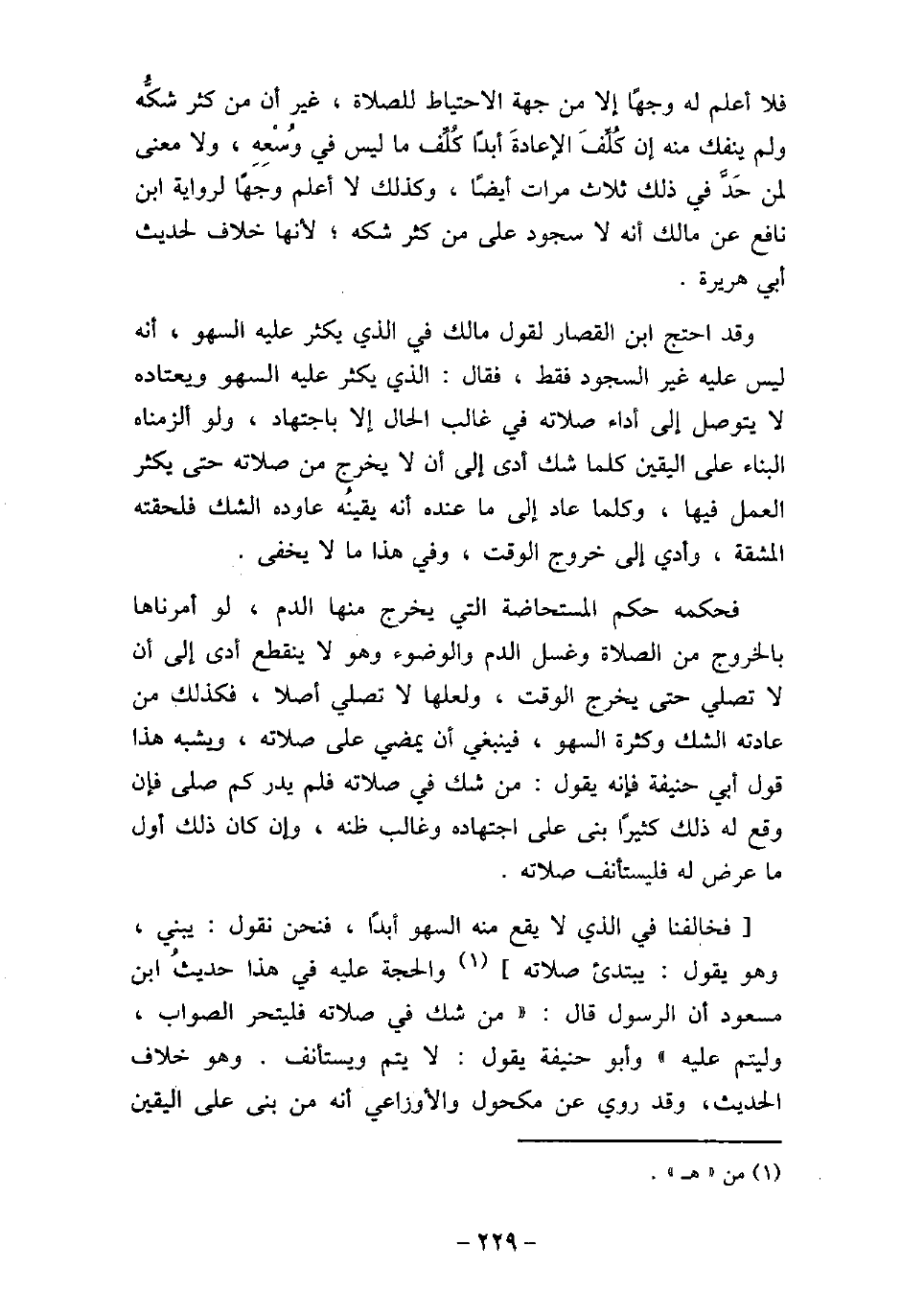فلا أعلم له وجهًا إلا من جهة الاحتياط للصلاة، غير أن من كثر شكه ولم ينفك منه إن كُلف أبدًا ما ليس فى وسعه، ولا معنى لمن حَدّ فى ذلك ثلاث مرات أيضًا، وكذلك لا أعلم وجها لرواية ابن نافع عن مالك، أنه لا سجود على من كثر شكه، لأنها خلاف لحديث أبى هريرة. وقد احتج ابن القصار لقول مالك فى الذى يكثر عليه السهو أنه ليس عليه غير السجود فقط، فقال: الذى يكثر عليه السهو ويعتاده لا يتوصل إلى أداء صلاته فى غالب الحال إلا باجتهاد، ولو ألزمناه البناء على اليقين كلما شك أدى إلى أن لا يخرج من صلاته حتى يكثر العمل فيها، وكلما عاد إلى ما عنده أنه يقينُه عاوده الشك، فلحقته المشقة، وأدى إلى خروج الوقت، وفى هذا ما لا يخفى. فحكمه حكم المستحاضة التى يخرج منها الدم، لو أمرناها بالخروج من الصلاة وغسل الدم، والوضوء وهو لا ينقطع أدى إلى أن لا تصلى حتى يخرج الوقت، ولعلها لا تصلى أصلاً، فكذلك من عادته الشك، وكثرة السهو، فينبغى أن يمضى على صلاته، ويشبه هذا قول أبو حنيفة فإنه يقول: من شك فى صلاته فلم يدر كم صلى فإن وقع له ذلك كثيرًا بنى على اجتهاده وغالب ظنه، وإن كان ذلك أول ما عرض له فليستأنف صلاته. فخالفنا فى الذى لا يقع منه السهو أبدًا، فنحن نقول: يبنى، وهو يقول: يبتدئ صلاته والحجة عليه فى هذا حديثُ ابن مسعود أن الرسول (صلى الله عليه وسلم) ، قال: (من شك فى صلاته فليتحر الصواب، وليتم عليه) ، وأبو حنيفة يقول: لا يتم ويستأنف. وهو خلاف الحديث، وقد روى عن مكحول، والأوزاعى أنه من بنى على اليقين