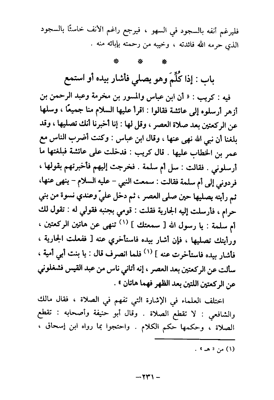 / 184 - فيه: كُرَيْبٍ، أَنَّ ابْنَ عَبَّاسٍ وَالْمِسْوَرَ بْنَ مَخْرَمَةَ وَعَبْدَالرَّحْمَنِ بْنَ أَزْهَرَ، أَرْسَلُوهُ إِلَى عَائِشَةَ، فَقَالُوا: اقْرَأْ عَلَيْهَا السَّلامَ مِنَّا جَمِيعًا، وَسَلْهَا عَنِ الرَّكْعَتَيْنِ بَعْدَ صَلاةِ الْعَصْرِ، وَقُلْ لَهَا: إِنَّا أُخْبِرْنَا عَنْكِ أَنَّكِ تُصَلِّينَهُمَا، وَقَدْ بَلَغَنَا أَنَّ نبى الله نَهَى عَنْهَا. وَقَالَ ابْنُ عَبَّاسٍ: وَكُنْتُ أَضْرِبُ النَّاسَ مَعَ عُمَرَ بْنِ الخَطَّابِ عَليهَا. قَالَ كُرَيْبٌ: فَدَخَلْتُ عَلَى عَائِشَةَ، فَبَلَّغْتُهَا مَا أَرْسَلُونِى، فَقَالَتْ: سَلْ أُمَّ سَلَمَةَ، فَخَرَجْتُ إِلَيْهِمْ، فَأَخْبَرْتُهُمْ بِقَوْلِهَا: فَرَدُّونِى إِلَى أُمِّ سَلَمَةَ، فَقَالَتْ: سَمِعْتُ النَّبِىَّ، (صلى الله عليه وسلم) ، يَنْهَى عَنْهَا، ثُمَّ رَأَيْتُهُ يُصَلِّيهِمَا، حِينَ صَلَّى الْعَصْرَ، ثُمَّ دَخَلَ عَلَىَّ وَعِنْدِى نِسْوَةٌ مِنْ بَنِى حَرَامٍ، فَأَرْسَلْتُ إِلَيْهِ الْجَارِيَةَ، فَقُلْتُ: قُومِى بِجَنْبِهِ، فَقُولِى لَهُ: تَقُولُ لَكَ أُمُّ سَلَمَةَ: يَا رَسُولَ اللَّهِ، سَمِعْتُكَ تَنْهَى عَنْ هَاتَيْنِ الركعتين، ورأيتك تُصَلِّيهِمَا، فَإِنْ أَشَارَ بِيَدِهِ، فَاسْتَأْخِرِى عَنْهُ، فَفَعَلَتِ الْجَارِيَةُ، فَأَشَارَ بِيَدِهِ، فَاسْتَأْخَرَتْ عَنْهُ، فَلَمَّا انْصَرَفَ، قَالَ: (يَا بِنْتَ أَبِى أُمَيَّةَ، سَأَلْتِ عَنِ الرَّكْعَتَيْنِ بَعْدَ الْعَصْرِ، وَإِنَّهُ أَتَانِى نَاسٌ مِنْ عَبْدِالْقَيْسِ، فَشَغَلُونِى عَنِ الرَّكْعَتَيْنِ اللَّتَيْنِ بَعْدَ الظُّهْرِ، فَهُمَا هَاتَانِ) . اختلف العلماء فى الإشارة التى تفهم فى الصلاة، فقال مالك والشافعى: لا تقطع الصلاة. وقال أبو حنيفة وأصحابه: تقطع الصلاة، وحكمها حكم الكلام. واحتجوا بما رواه ابن إسحاق،