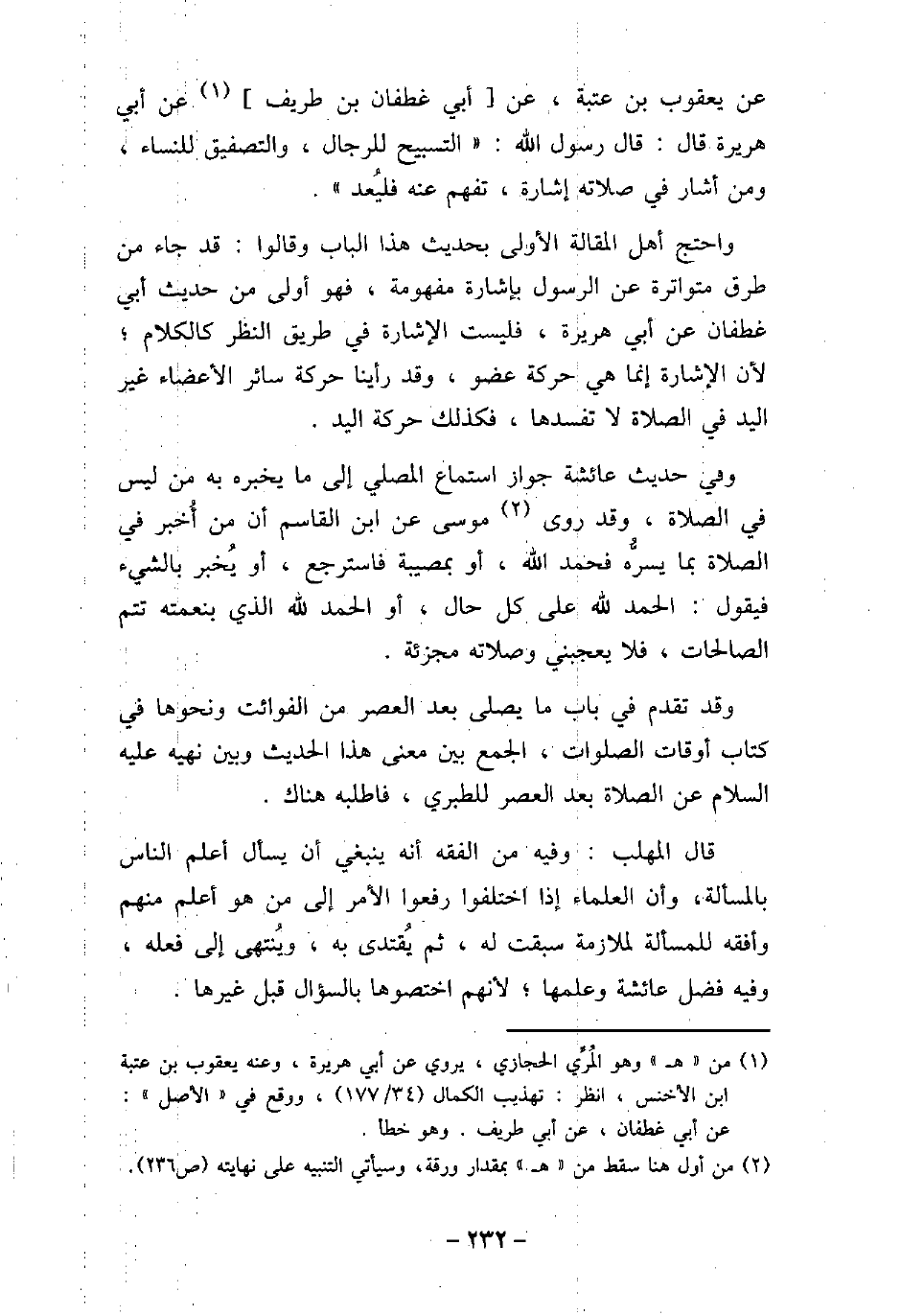عن يعقوب بن عتبة، عن أبى غطفان بن طريف، عن أبى هريرة، قال: قال رسول الله (صلى الله عليه وسلم) : (التسبيح للرجال، والتصفيق للنساء، ومن أشار فى صلاته إشارة، تفهم عنه فليُعد) . واحتج أهل المقالة الأولى بحديث هذا الباب، وقالوا: قد جاء من طرق متواترة عن الرسول (صلى الله عليه وسلم) بإشارة مفهومة، فهو أولى من حديث أبى غطفان عن أبى هريرة، فليست الإشارة فى طريق النظر كالكلام، لأن الإشارة إنما هى حركة عضو، وقد رأينا حركة سائر الأعضاء غير اليد فى الصلاة لا تفسدها، فكذلك حركة اليد. وفى حديث عائشة جواز استماع المصلى إلى ما يخبره به من ليس فى الصلاة، وقد روى موسى عن ابن القاسم، أن من أخبر فى الصلاة بما يسرُّه، فحمد الله، أو بمصيبة فاسترجع، أو يخبر بشىء فيقول: الحمد لله على كل حال، أو الحمد لله الذى بنعمته تتم الصالحات، فلا يعجبنى وصلاته مجزئة. وقد تقدم فى باب ما يصلى بعد العصر من الفوائت ونحوها فى كتاب أوقات الصلوات، الجمع بين معنى هذا الحديث، وبين نهيه (صلى الله عليه وسلم) عن الصلاة بعد العصر للطبرى، فاطلبه هناك. قال المهلب: وفيه من الفقه أنه ينبغى أن يسأل أعلم الناس بالمسألة، وأن العلماء إذا اختلفوا رفعوا الأمر إلى من هو أعلم منهم وأفقه للمسألة لملازمة سبقت له، ثم يُقتدى به، ويُنتهى إلى فعله، وفيه فضل عائشة وعلمها، لأنهم اختصوها بالسؤال قبل غيرها.