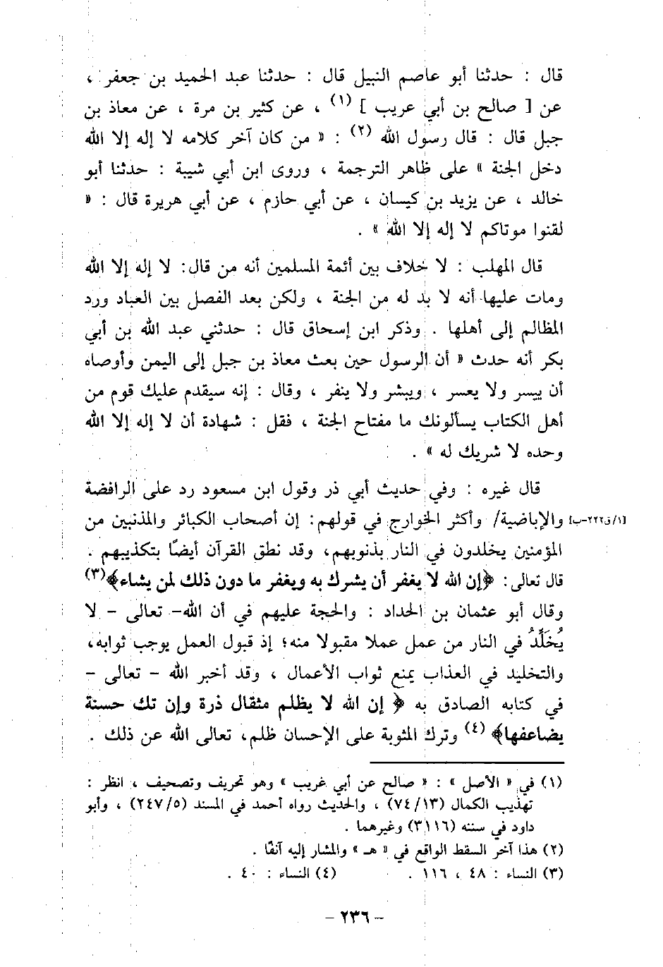 قال: حدثنا أبو عاصم النبيل، قال: حدثنا عبد الحميد بن جعفر، عن صالح بن أبى عريب، عن كثير بن مرة، عن معاذ بن جبل، قال: قال رسول الله (صلى الله عليه وسلم) : (من كان آخر كلامه لا إله إلا الله دخل الجنة) ، على ظاهر الترجمة. وروى ابن أبى شيبة، حدثنا أبو خالد، عن يزيد بن كيسان، عن أبى حازم، عن أبى هريرة، قال: (لقنوا موتاكم لا إله إلا الله) . قال المهلب: لا خلاف بين أئمة المسلمين أنه من قال: لا إله إلا الله، ومات عليها أنه لابد له من الجنة، ولكن بعد الفصل بين العباد ورد المظالم إلى أهلها. وذكر ابن إسحاق، قال: حدثنى عبد الله بن أبى بكر أنه حدث: أن الرسول (صلى الله عليه وسلم) حين بعث معاذ ابن جبل إلى اليمن وأوصاه أن ييسر ولا يعسر، ويبشر ولا ينفر، وقال: (إنه سيقدم عليك قوم من أهل الكتاب يسألونك ما مفتاح الجنة؟ فقل: شهادة أن لا إله إلا الله، وحده لا شريك له) . قال غيره: وفى حديث أبى ذر وقول ابن مسعود رد على الرافضة والإباضية، وأكثر الخوارج فى قولهم: إن أصحاب الكبائر والمذنبين من المؤمنين يخلدون فى النار بذنوبهم، وقد نطق القرآن أيضًا بتكذيبهم. قال تعالى: (إن الله لا يغفر أن يشرك به ويغفر ما دون ذلك لمن يشاء) [النساء: 48] . وقال أبو عثمان بن الحداد: والحجة عليهم فى أن الله تعالى لا يُخَلِّدُ فى النار من عمل عملاً مقبولاً منه، إذ قبول العمل يوجب ثوابه، والتخليد فى العذاب يمنع ثواب الأعمال، وقد أخبر الله تعالى فى كتابه الصادق به) إن الله لا يظلم مثقال ذرة وإن تك حسنة يضاعفها) [النساء: 40] ، وترك المثوبة على الإحسان ظلم، تعالى الله عن ذلك.