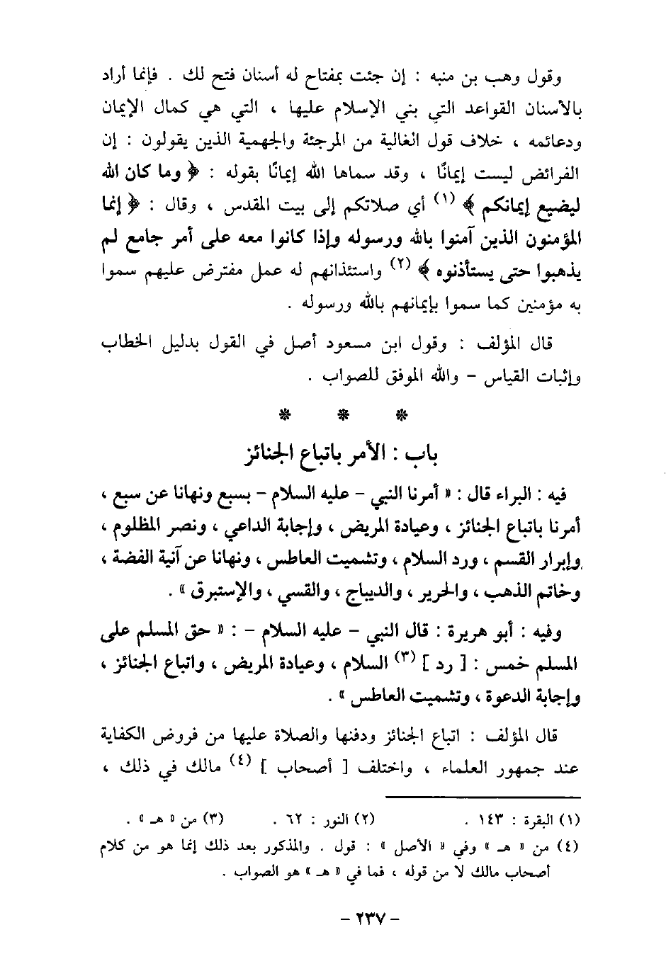 / 3 - فيه: الْبَرَاءِ، قَالَ: أَمَرَنَا النَّبِىُّ، (صلى الله عليه وسلم) ، بِسَبْعٍ وَنَهَانَا عَنْ سَبْعٍ: (أَمَرَنَا بِاتِّبَاعِ الْجَنَائِزِ، وَعِيَادَةِ الْمَرِيضِ، وَإِجَابَةِ الدَّاعِى، وَنَصْرِ الْمَظْلُومِ، وَإِبْرَارِ الْقَسَمِ، وَرَدِّ السَّلامِ، وَتَشْمِيتِ الْعَاطِسِ. وَنَهَانَا: عَنْ آنِيَةِ الْفِضَّةِ، وَخَاتَمِ الذَّهَبِ، وَالْحَرِيرِ، وَالدِّيبَاجِ، وَالْقَسِّىِّ، وَالإسْتَبْرَقِ) . / 4 - وفيه: أَبُو هُرَيْرَةَ، قَالَ النَّبِىّ، (صلى الله عليه وسلم) : (حَقُّ الْمُسْلِمِ عَلَى الْمُسْلِمِ خَمْسٌ: رَدُّ السَّلامِ، وَعِيَادَةُ الْمَرِيضِ، وَاتِّبَاعُ الْجَنَائِزِ، وَإِجَابَةُ الدَّعْوَةِ، وَتَشْمِيتُ الْعَاطِسِ) . قال المؤلف: اتباع الجنائز ودفنها والصلاة عليها من فروض الكفاية عند جمهور العلماء، واختلف أصحاب مالك فى ذلك،