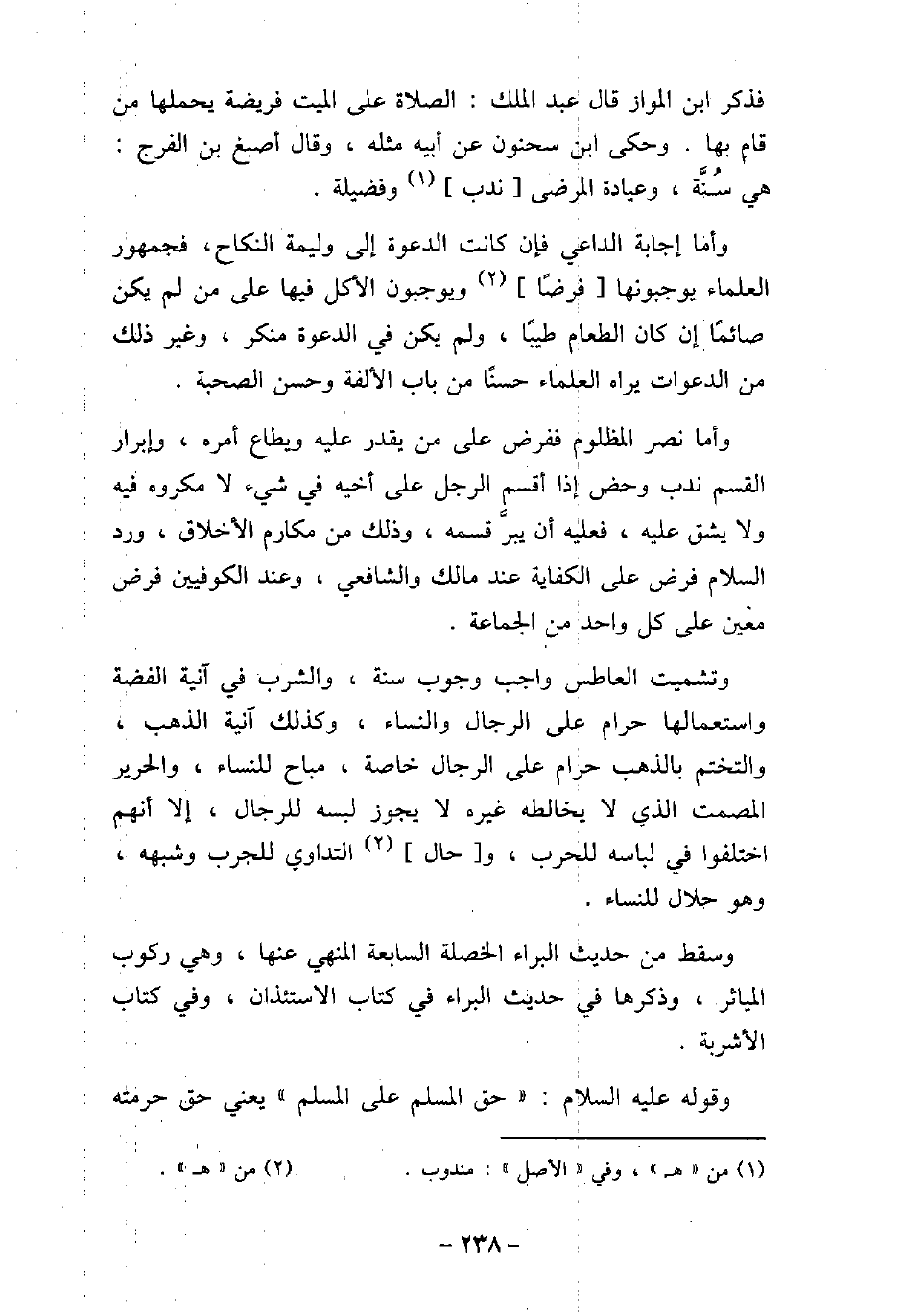 فذكر ابن المواز، قال عبد الملك: الصلاة على الميت فريضة يحملها من قام بها. وحكى ابن سحنون عن أبيه مثله، وقال أصبغ بن الفرج: هى سُنَّة، وعيادة المرضى ندب وفضيلة. وأما إجابة الداعى فإن كانت الدعوة إلى وليمة النكاح، فجمهور العلماء يوجبونها فرضًا، ويوجبون الأكل فيها على من لم يكن صائمًا إن كان الطعام طيبًا، ولم يكن فى الدعوة منكر، وغير ذلك من الدعوات يراه العلماء حسنًا من باب الألفة وحسن الصحبة. وأما نصر المظلوم ففرض على من يقدر عليه ويطاع أمره، وإبرار القسم ندب وحض إذا أقسم الرجل على أخيه فى شىء لا مكروه فيه ولا يشق عليه، فعليه أن يبرَّ قسمه، وذلك من مكارم الأخلاق، ورد السلام فرض على الكفاية عند مالك والشافعى، وعند الكوفيين فرض معين على كل واحد من الجماعة. وتشميت العاطس واجب وجوب سنة، والشرب فى آنية الفضة واستعمالها حرام على الرجال والنساء، وكذلك آنية الذهب، والتختم بالذهب حرام على الرجال خاصة، مباح للنساء، والحرير المصمت الذى لا يخالطه غيره لا يجوز لبسه للرجال، إلا أنهم اختلفوا فى لباسه للحرب، وحال التداوى للجرب وشبهه، وهو حلال للنساء. وسقط من حديث البراء الخصلة السابعة المنهى عنها، وهى ركوب المياثر، وذكرها فى حديث البراء فى كتاب الاستئذان، وفى كتاب الأشربة. وقوله (صلى الله عليه وسلم) : (حقى المسلم على المسلم) يعنى حق حرمته