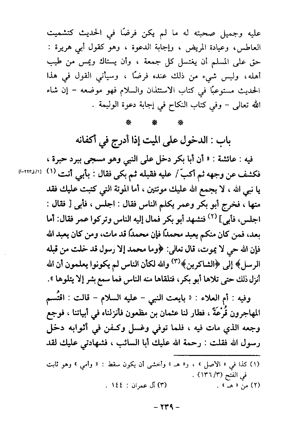 / 5 - فيه: عَائِشَةَ أن أَبَا بَكْرٍ دخل عَلَى النَّبِىَّ (صلى الله عليه وسلم) وَهُوَ مُسَجًّى بِبُرْدِ حِبَرَةٍ، فَكَشَفَ عَنْ وَجْهِهِ، ثُمَّ أَكَبَّ عَلَيْهِ فَقَبَّلَهُ، ثُمَّ بَكَى، فَقَالَ: بِأَبِى أَنْتَ يَا نَبِىَّ اللَّهِ، لا يَجْمَعُ اللَّهُ عَلَيْكَ مَوْتَتَيْنِ، أَمَّا الْمَوْتَةُ الَّتِى كُتِبَتْ عَلَيْكَ فَقَدْ مُتَّهَا. فخَرَجَ أَبُو بَكْرٍ، وَعُمَرُ يُكَلِّمُ النَّاسَ، فَقَالَ: اجْلِسْ، فَأَبَى، فَقَالَ: اجْلِسْ، فَأَبَى، فَتَشَهَّدَ أَبُو بَكْرٍ، فَمَالَ إِلَيْهِ النَّاسُ وَتَرَكُوا عُمَرَ، فَقَالَ: أَمَّا بَعْدُ، فَمَنْ كَانَ مِنْكُمْ يَعْبُدُ مُحَمَّدًا (صلى الله عليه وسلم) فَإِنَّ مُحَمَّدًا (صلى الله عليه وسلم) قَدْ مَاتَ، وَمَنْ كَانَ يَعْبُدُ اللَّهَ فَإِنَّ اللَّهَ حَىٌّ لا يَمُوتُ، قَالَ اللَّهُ تَعَالَى: (وَمَا مُحَمَّدٌ إِلا رَسُولٌ قَدْ خَلَتْ مِنْ قَبْلِهِ الرُّسُلُ (إِلَى) الشَّاكِرِينَ) [آل عمران: 144] وَاللَّهِ لَكَأَنَّ النَّاسَ لَمْ يَكُونُوا يَعْلَمُونَ أَنَّ اللَّهَ أَنْزَلَهَا، حَتَّى تَلاهَا أَبُو بَكْرٍ، فَتَلَقَّاهَا مِنْهُ النَّاسُ، فَمَا سمَعُ بَشَرٌ إِلا يَتْلُوهَا. / 6 - وفيه: أُمَّ الْعَلاءِ، بَايَعَتِ النَّبِىَّ، (صلى الله عليه وسلم) ، قَالَتِّ اقْتُسِمَ الْمُهَاجِرُونَ قُرْعَةً، فَطَارَ لَنَا عُثْمَانُ بْنُ مَظْعُونٍ، فَأَنْزَلْنَاهُ فِى أَبْيَاتِنَا، فَوَجِعَ وَجَعَهُ الَّذِى مَاتَ فِيهِ، فَلَمَّا تُوُفِّىَ، وَغُسِّلَ وَكُفِّنَ فِى أَثْوَابِهِ، دَخَلَ رَسُولُ اللَّهِ (صلى الله عليه وسلم) فَقُلْتُ: رَحْمَةُ اللَّهِ عَلَيْكَ أَبَا السَّائِبِ، فَشَهَادَتِى عَلَيْكَ، لَقَدْ