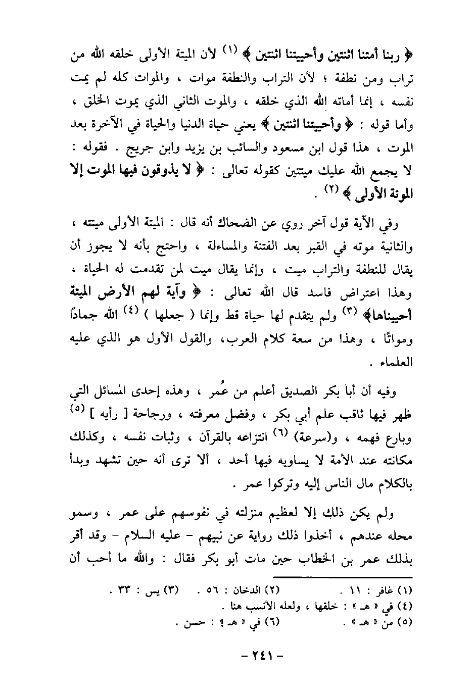 ) ربنا أمتنا اثنتين وأحييتنا اثنتين) [غافر: 11] ، لأن الميتة الأولى خلقه الله من تراب ومن نطفة، لأن التراب والنطفة موات، والموات كله لم يمت نفسه، وإنما أماته الله الذى خلقه، والموت الثانى الذى يموت الخلق، وأما قوله: (وأحييتنا اثنتين (يعنى حياة الدنيا والحياة فى الآخرة بعد الموت، هذا قول ابن مسعود والسائب بن يزيد وابن جريج، فقوله: لا يجمع الله عليك ميتتين كقوله تعالى: (لا يذوقون فيها الموت إلا الموتة الأولى) [الدخان: 56] . وفى الآية قول آخر روى عن الضحاك أنه قال: الميتة الأولى ميتته، والثانية موته فى القبر بعد الفتنة والمساءلة، واحتج بأنه لا يجوز أن يقال للنطفة والتراب ميت، وإنما يقال: ميت لمن تقدمت له الحياة، وهذا اعتراض فاسد، قال الله تعالى: (وآية لهم الأرض الميتة أحييناها) [يس: 33] ولم يتقدم لها حياة قط، وإنما جعلها الله جمادًا ومواتًا، وهذا من سعة كلام العرب، والقول الأول هو الذى عليه العلماء. وفيه أن أبا بكر الصديق أعلم من عُمر، وهذه إحدى المسائل التى ظهر فيها ثاقب علم أبى بكر، وفضل معرفته، ورجاحة رأيه وبارع فهمه، وسرعة انتزاعه بالقرآن، وثبات نفسه، وكذلك مكانته عند الأمة لا يساويه فيها أحد، ألا ترى أنه حين تشهد وبدأ بالكلام مال الناس إليه، وتركوا عمر. ولم يكن ذلك إلا لعظيم منزلته فى نفوسهم على عمر، وسمو محله عندهم، أخذوا ذلك رواية عن نبيهم، (صلى الله عليه وسلم) ، وقد أقر بذلك عمر بن الخطاب حين مات أبى بكر، فقال: والله ما أحب أن